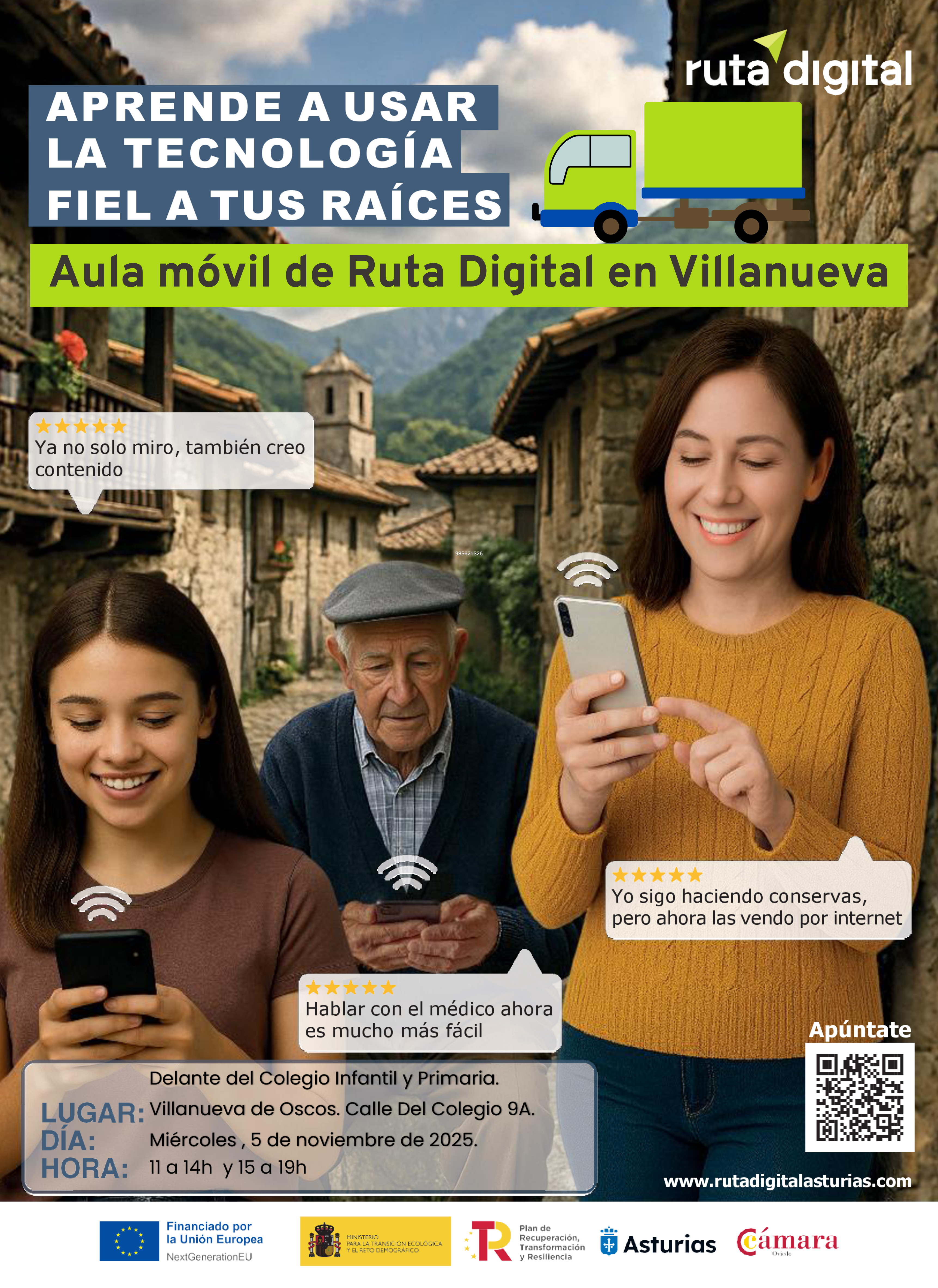 El miércoles 5 de noviembre, acércate a Villanueva a descubrir cómo desenvolverte mejor en el mundo digital en el aula móvil de Ruta Digital Asturias, equipada con ordenadores y conexión a internet: