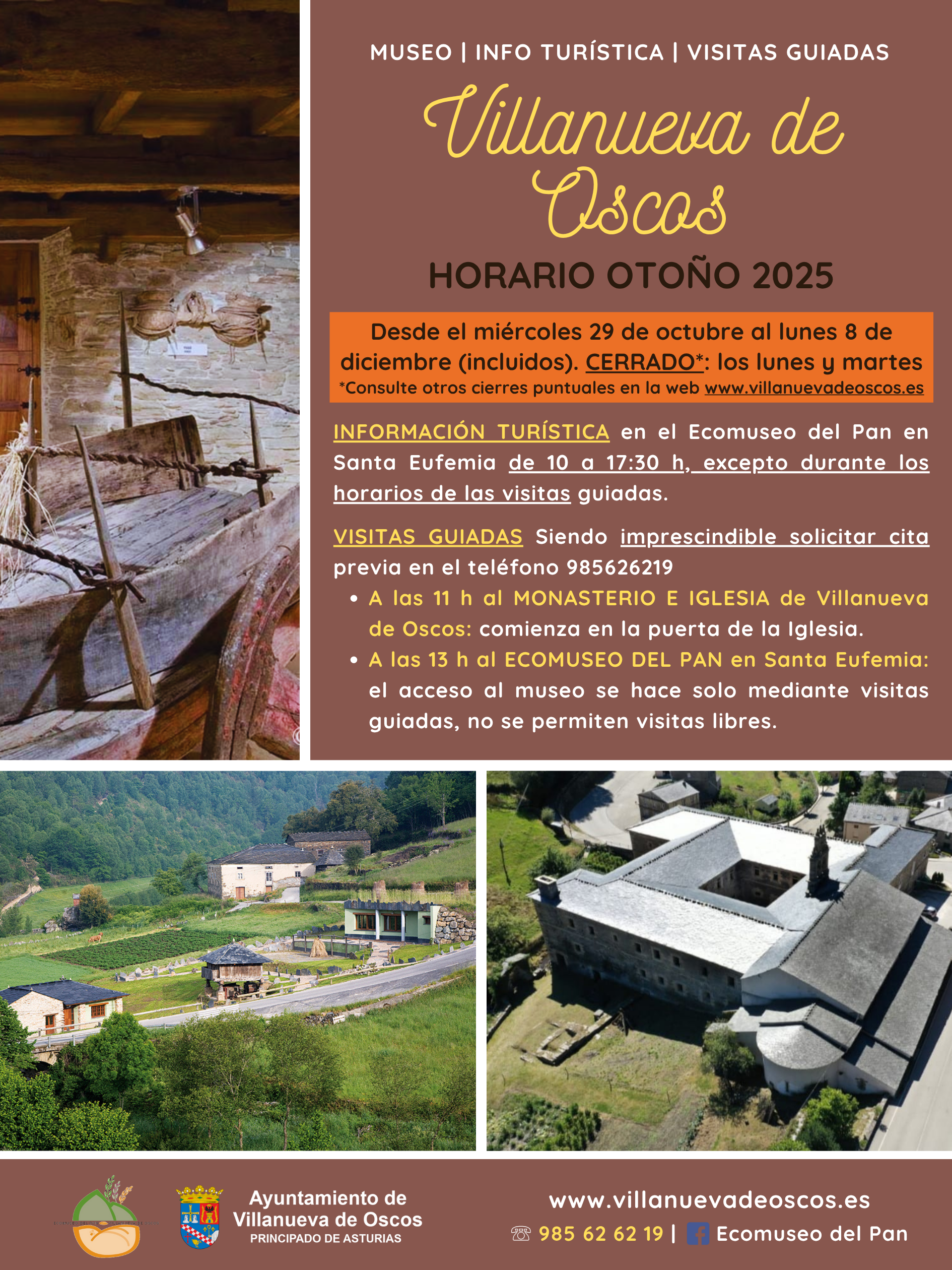 (Info turística y visitas guiadas) Desde el miércoles 29 de octubre al lunes 8 de diciembre (incluidos). CERRADO*: los lunes y martes. *Consulte otros cierres puntuales en la web municipal www.villanuevadeoscos.es