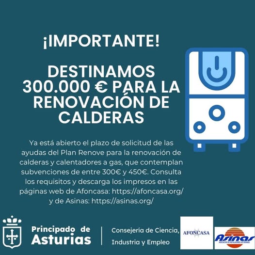 Información pública del Plan de Actuación del año 2025 presentado por “Afoncasa” y “Asinas” en lo relativo a las ayudas para la renovación de calderas y calentadores de agua a gas (Plan Renove calderas/calentadores 2025). Exptes. AYUD/2025/22779-AYUD/2025/22987 https://miprincipado.asturias.es/bopa/2025/10/17(...)