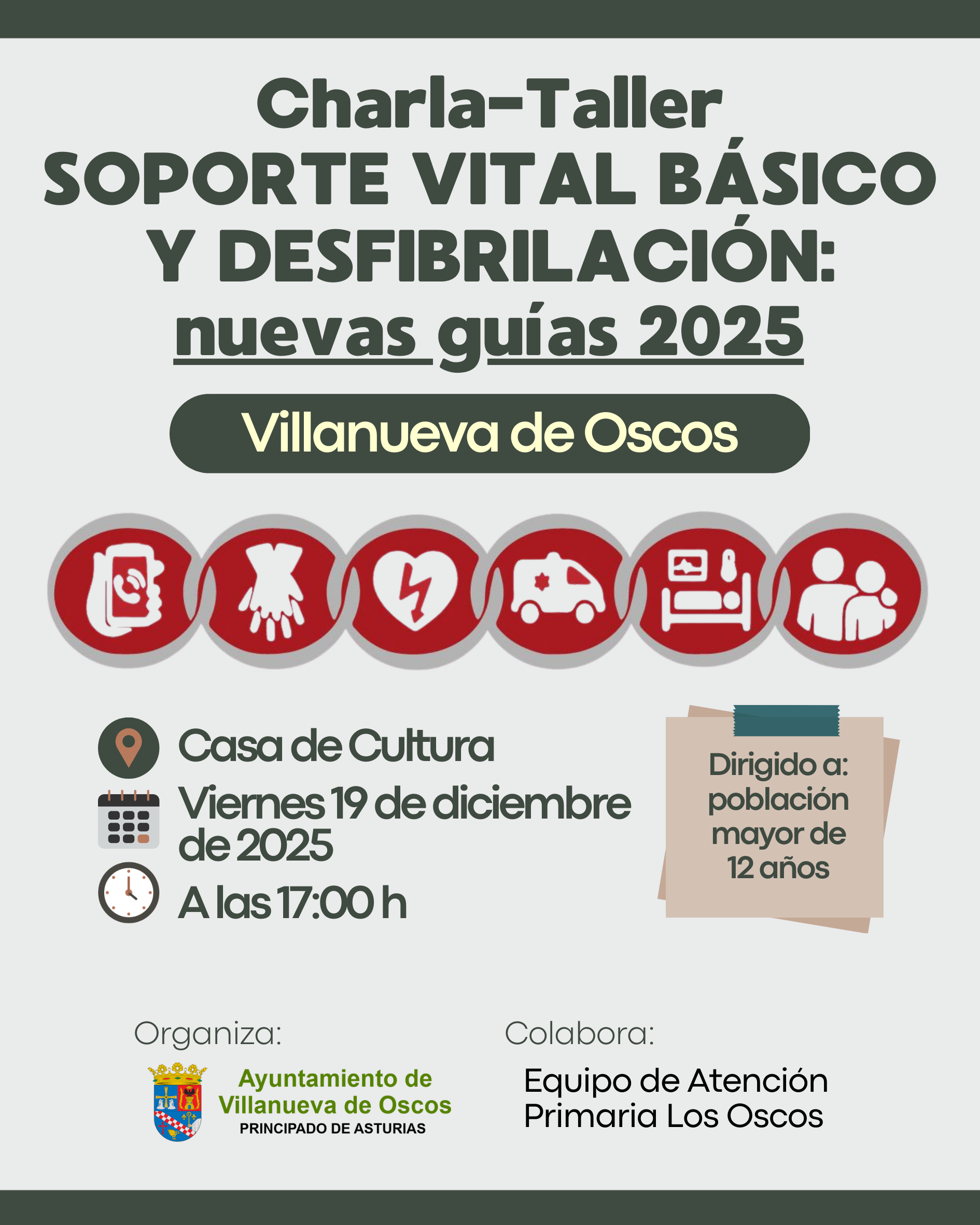 El viernes 19 de diciembre a las 17:00 h, se realizará en la Casa de Cultura de Villanueva de Oscos, un taller práctico sobre SOPORTE VITAL BÁSICO y DESFIBRILACIÓN dirigido a población mayor de 12 años.