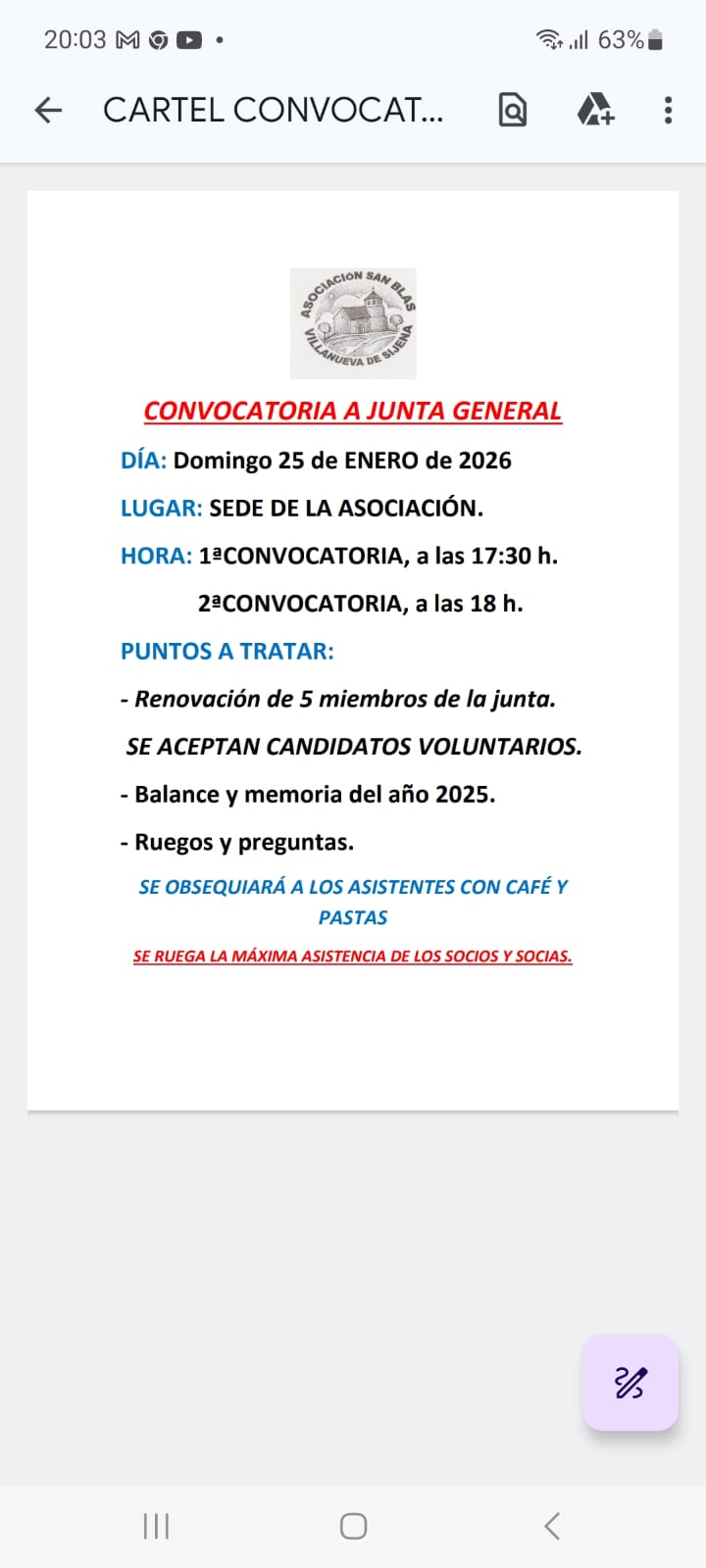 La asociación de mujeres y consumidores San Blas convoca junta general el próximo domingo 25 de enero a las 17:30 horas.