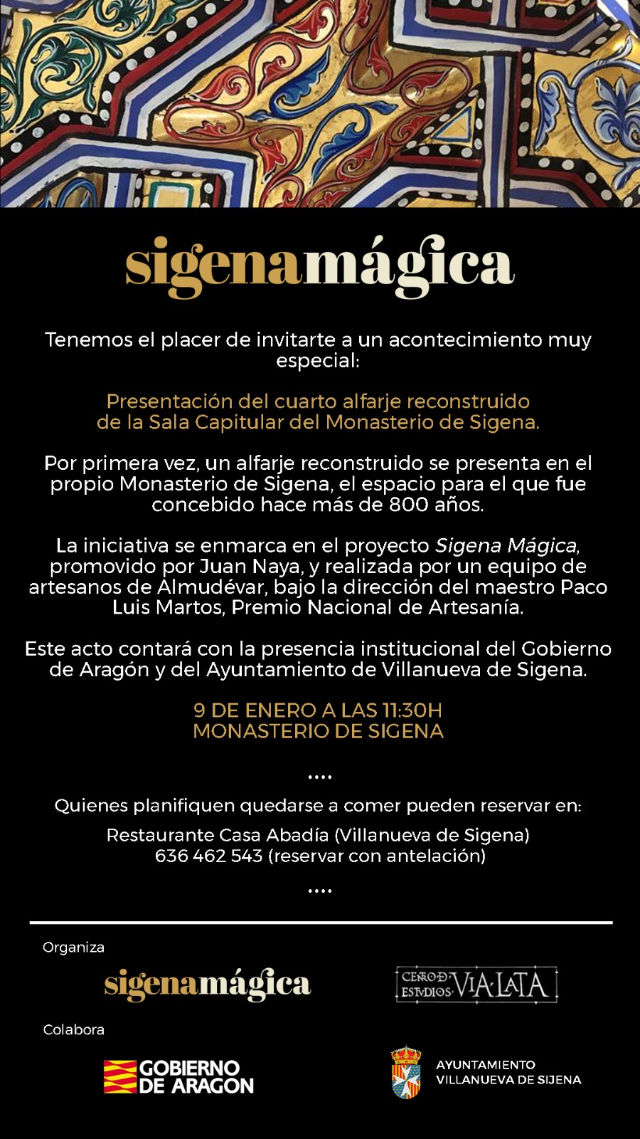 El Ayuntamiento de Villanueva de Sijena inviita a todos los vecinos a la presentación del cuarto alfarje reconstruido de la Sala Capitular, este trabajo forma parte del proyecto Sijena Mágica realizado por un equipo de artesanos de Almudévar, dirigidos por Paco Luis Martos, Premio Nacional de Artesanía.