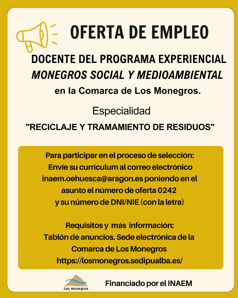 La Comarca de Los Monegros lanza este programa, financiado por el INAEM, con 16 plazas de alumnado-trabajador y 2 puestos para personal docente. Especialidades: Ayuda a domicilio y Reciclaje y Tratamiento de Residuos.