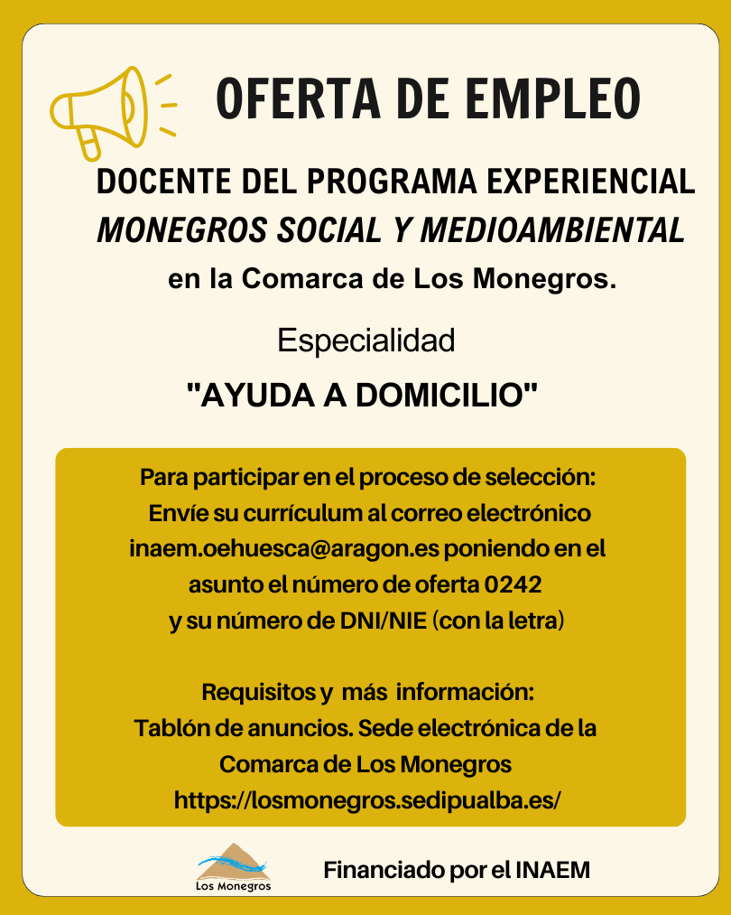 SELECCIÓN DE DOCENTES Y ALUMNADO PROGRAMA EXPERIENCIAL “MONEGROS SOCIAL Y MEDIOAMBIENTAL”2026-01-20 08:53:16Info GeneralLa Comarca de Los Monegros lanza este programa, financiado por el INAEM, con 16 plazas de alumnado-trabajador y 2 puestos para personal docente. Especialidades: Ayuda a domicilio y Reciclaje y Tratamiento de Residuos.
