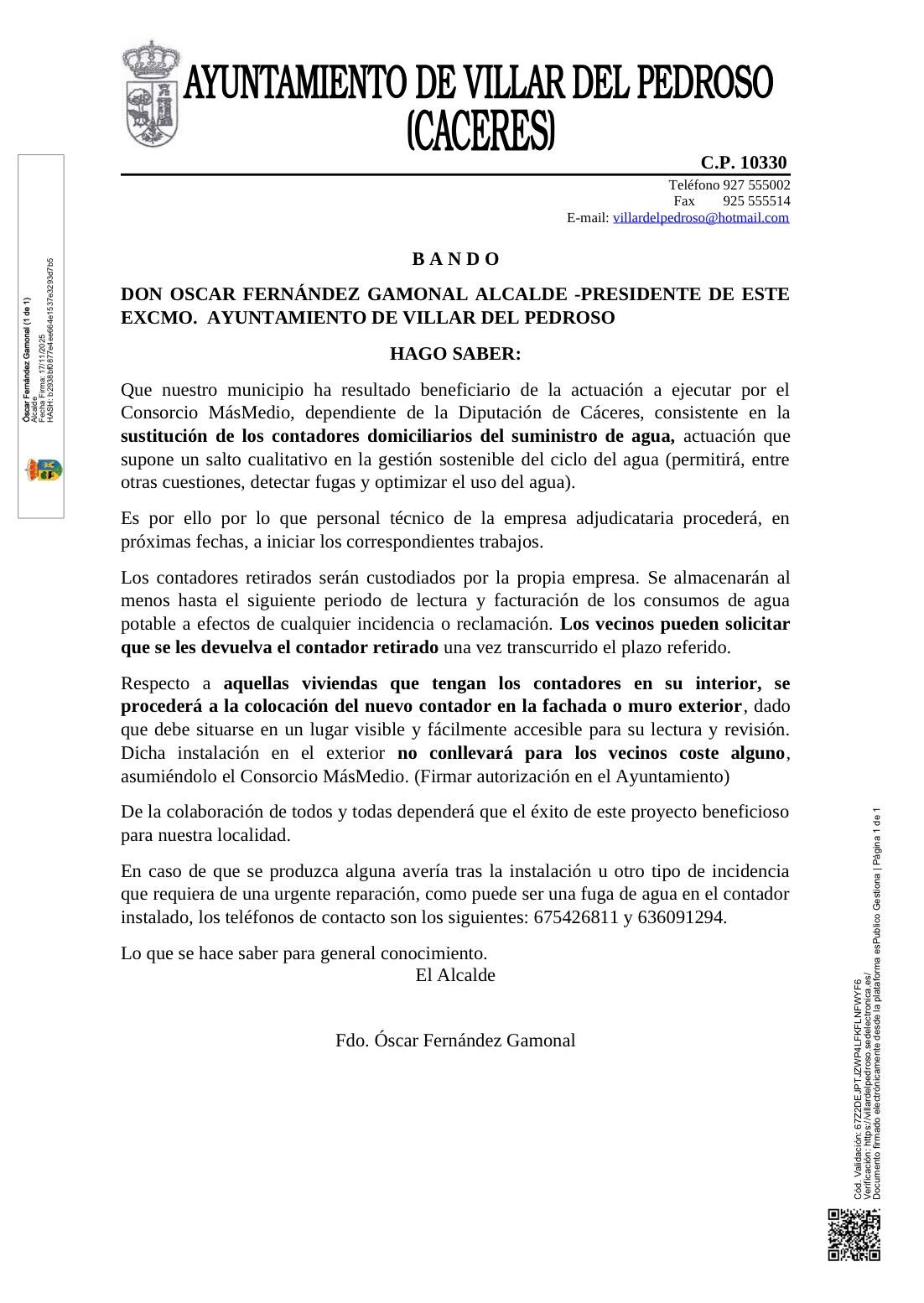 SE INFORMA QUE EL BANDO PUBLICADO EL PASADO 17/NOVIEMBRE/2025, SOBRE SUSTITUCIÓN DE CONTADORES DE AGUA, NO IMPLICA NINGÚN TIPO DE GASTO PARA LOS VECINOS.