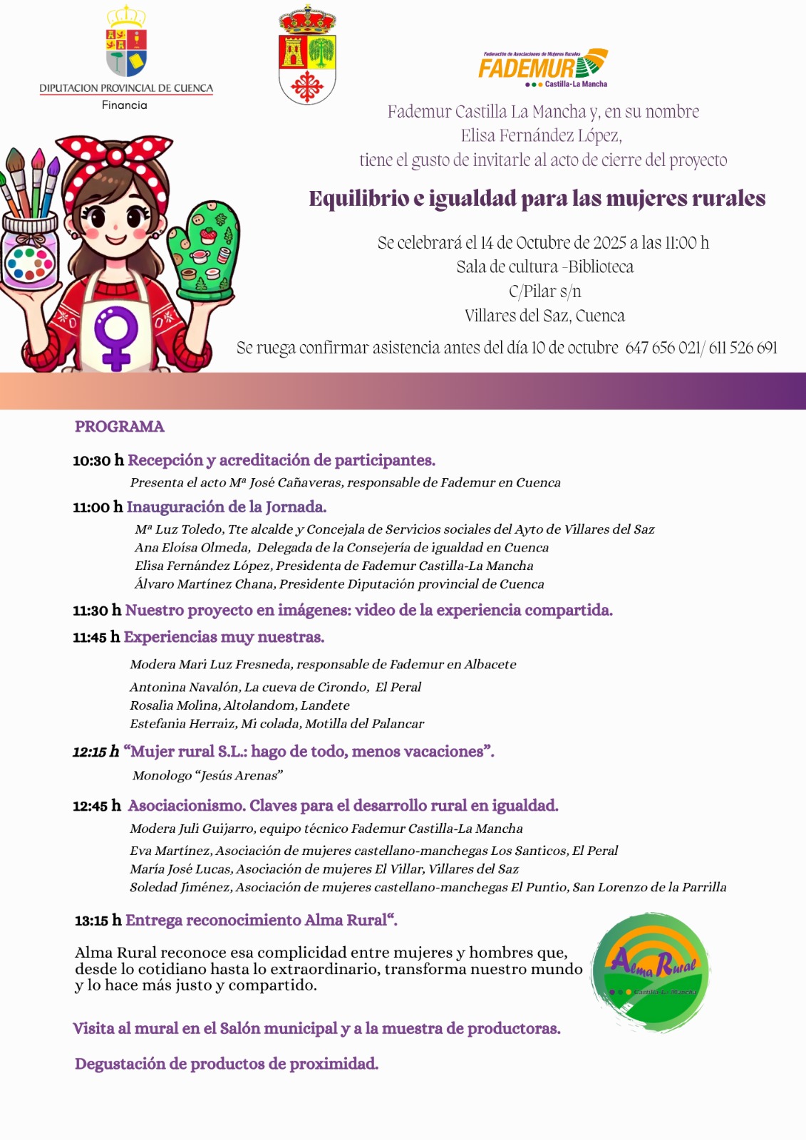 La jornada está organizada por la federación de mujeres rurales FADEMUR de Castilla-La Mancha, financiada por la Diputación Provincial de Cuenca y cuenta con la colaboración del Ayuntamiento de Villares del Saz y la Asociación local de Mujeres "El Villar".