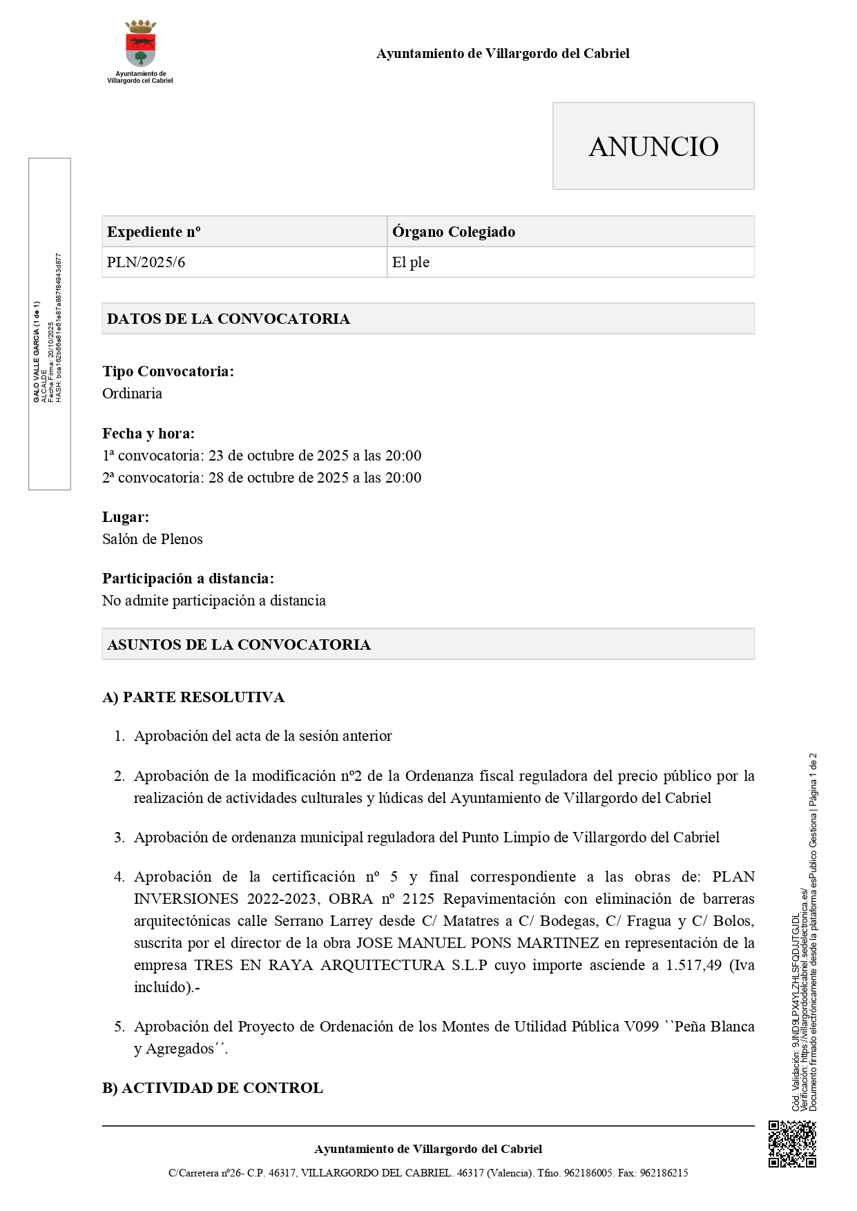 CONVOCATORIA DE PLENO ORDINARIO ESTE JUEVES 23 DE OCTUBRE DE 2025 A LAS 20H