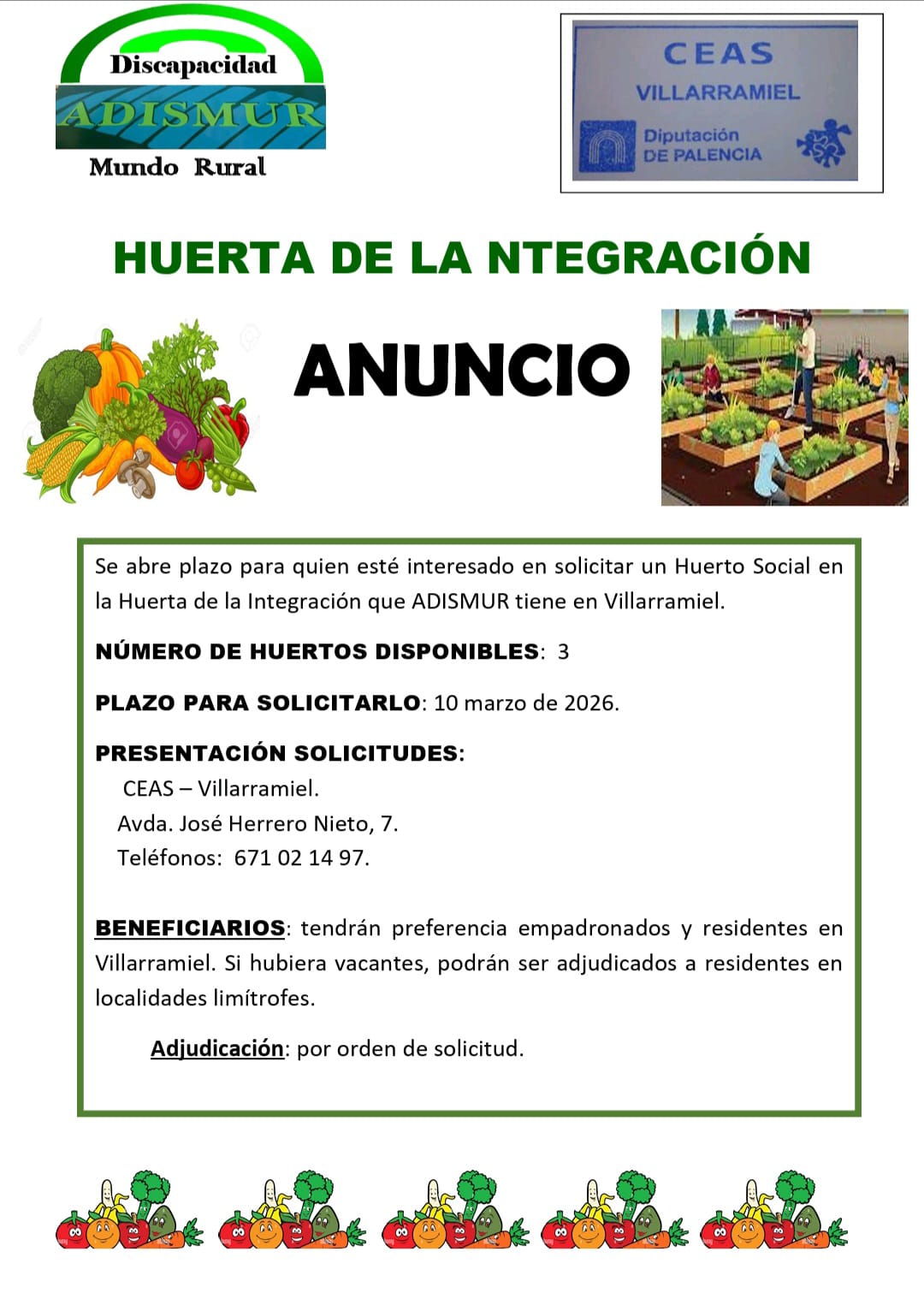 Abierto el plazo para solicitar un HUERTO SOCIAL en la Huerta de la Integración que ADISMUR tiene en Villarramiel.