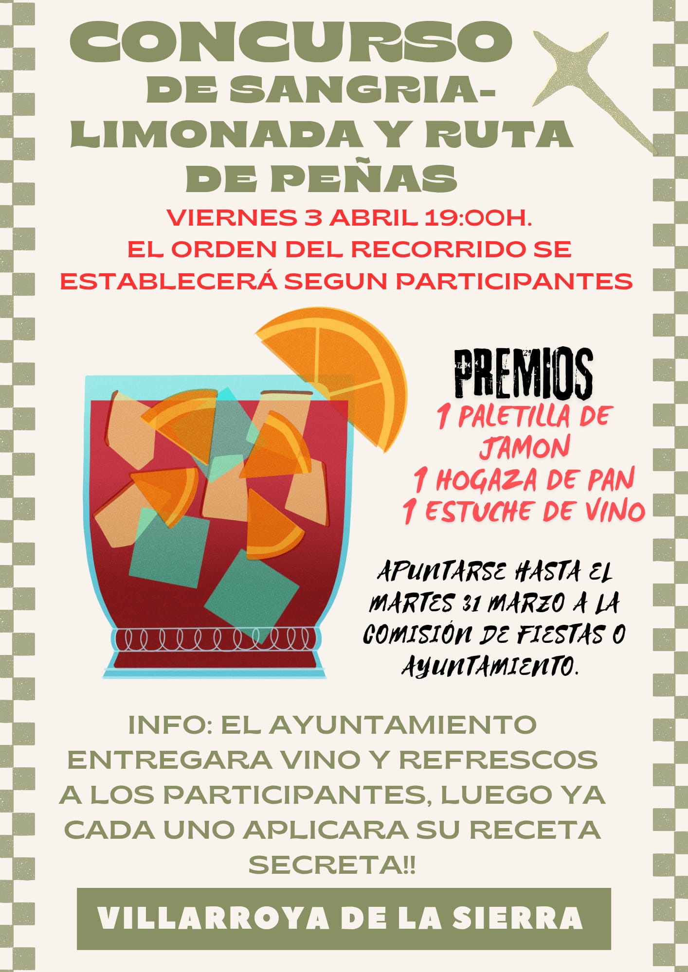 - Viernes, 3 de abril de 2026, 19:00 h: Concurso de sangría-limonada y recorrido de peñas.