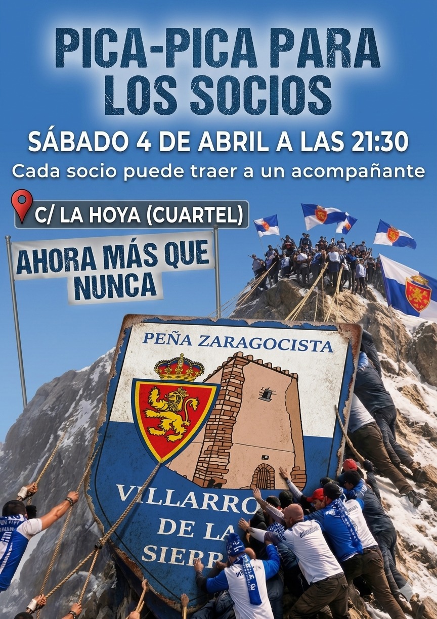 📢 La Peña Zaragocista invita al pica-pica que tendrá lugar el sábado, 4 de abril de 2026, a las 21:30 h en El Cuartel.