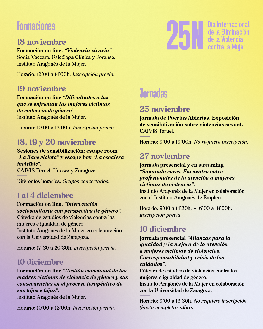 El Instituto Aragonés de la mujer, organiza un amplio programa de actividades que incluye diferentes formaciones y jornadas al objeto de sensibilizar a la sociedad en general acerca de las violencias contra las mujeres, así como promover la formación de profesionales, comenzando el 18 de noviembre y hasta el próximo 10 de diciembre.
