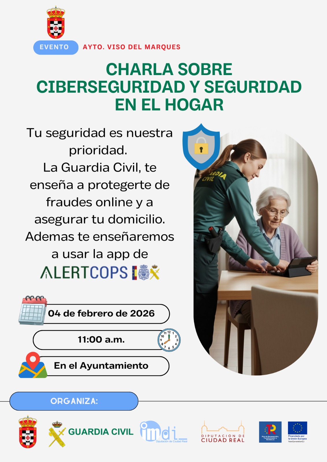 El miércoles, 4 de febrero de 2026, a las 11:00 h, tendrá lugar en el salón de actos del Ayuntamiento una charla sobre ciberseguridad y seguridad en el hogar. La Guardia Civil ofrecerá recomendaciones para proteger su domicilio y mostrará cómo utilizar la aplicación AlertCops.