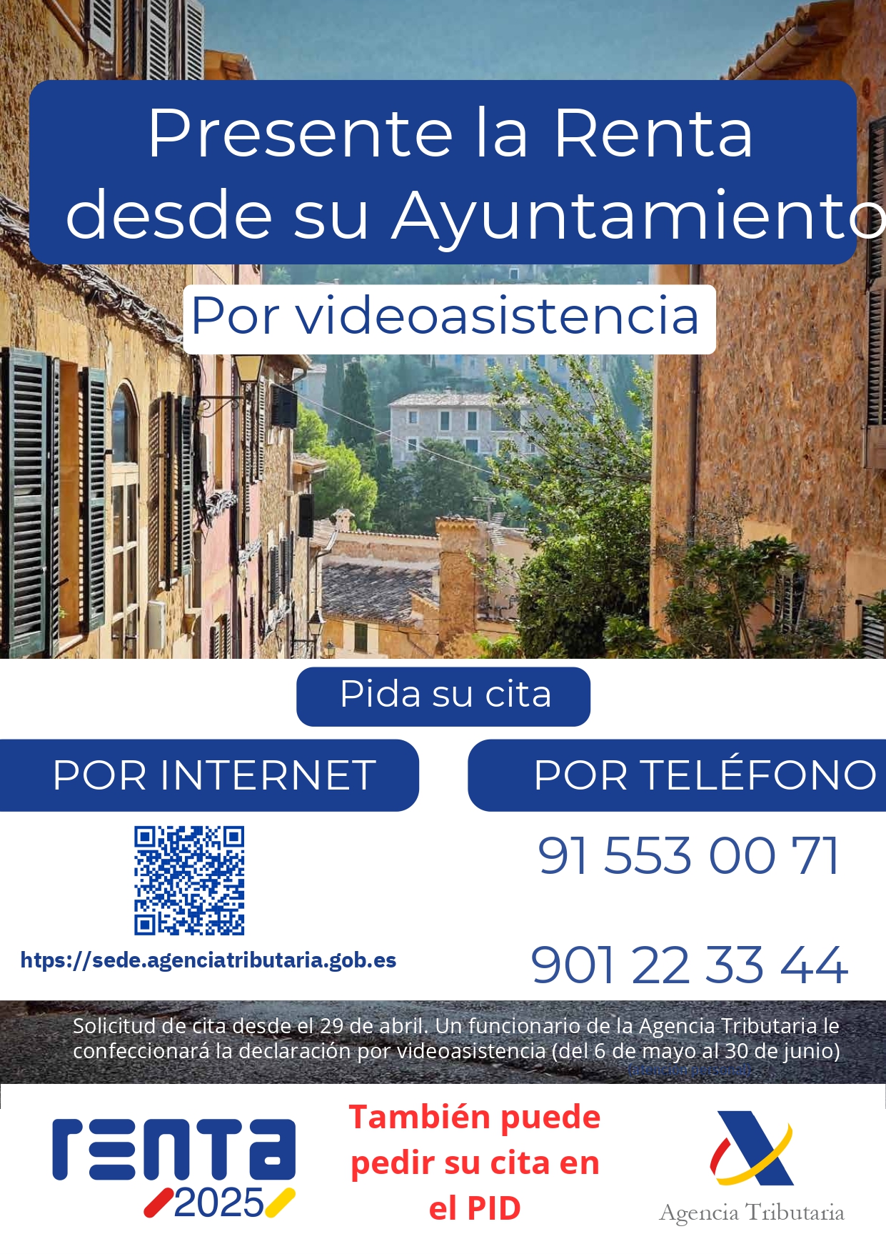 El Ayuntamiento informa a todos los vecinos que ya pueden solicitar cita previa para presentar la Declaración de la Renta 2025 mediante videoasistencia, de forma cómoda y sin desplazamientos.