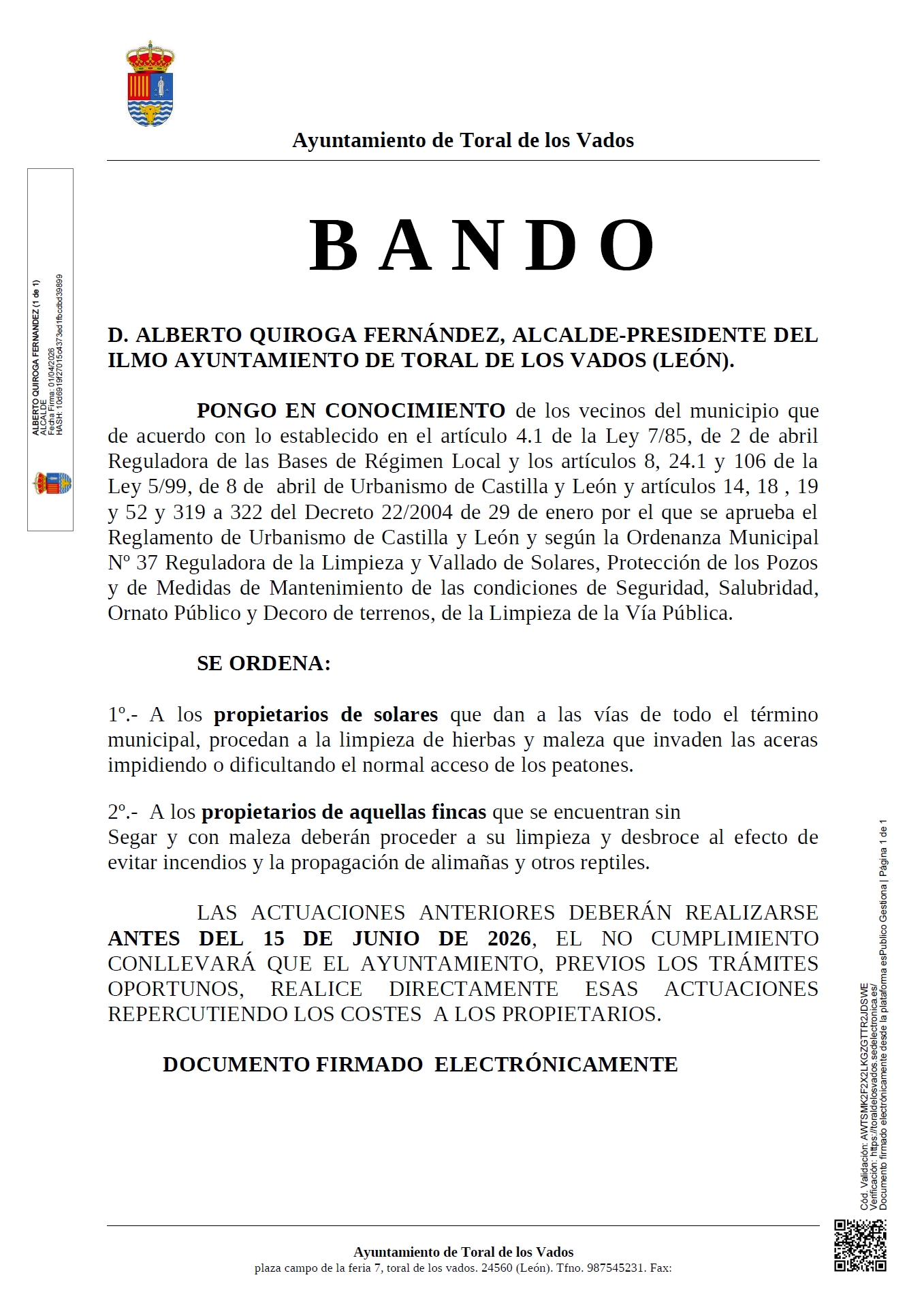 D. ALBERTO QUIROGA FERNÁNDEZ, ALCALDE-PRESIDENTE DEL ILMO AYUNTAMIENTO DE TORAL DE LOS VADOS (LEÓN).