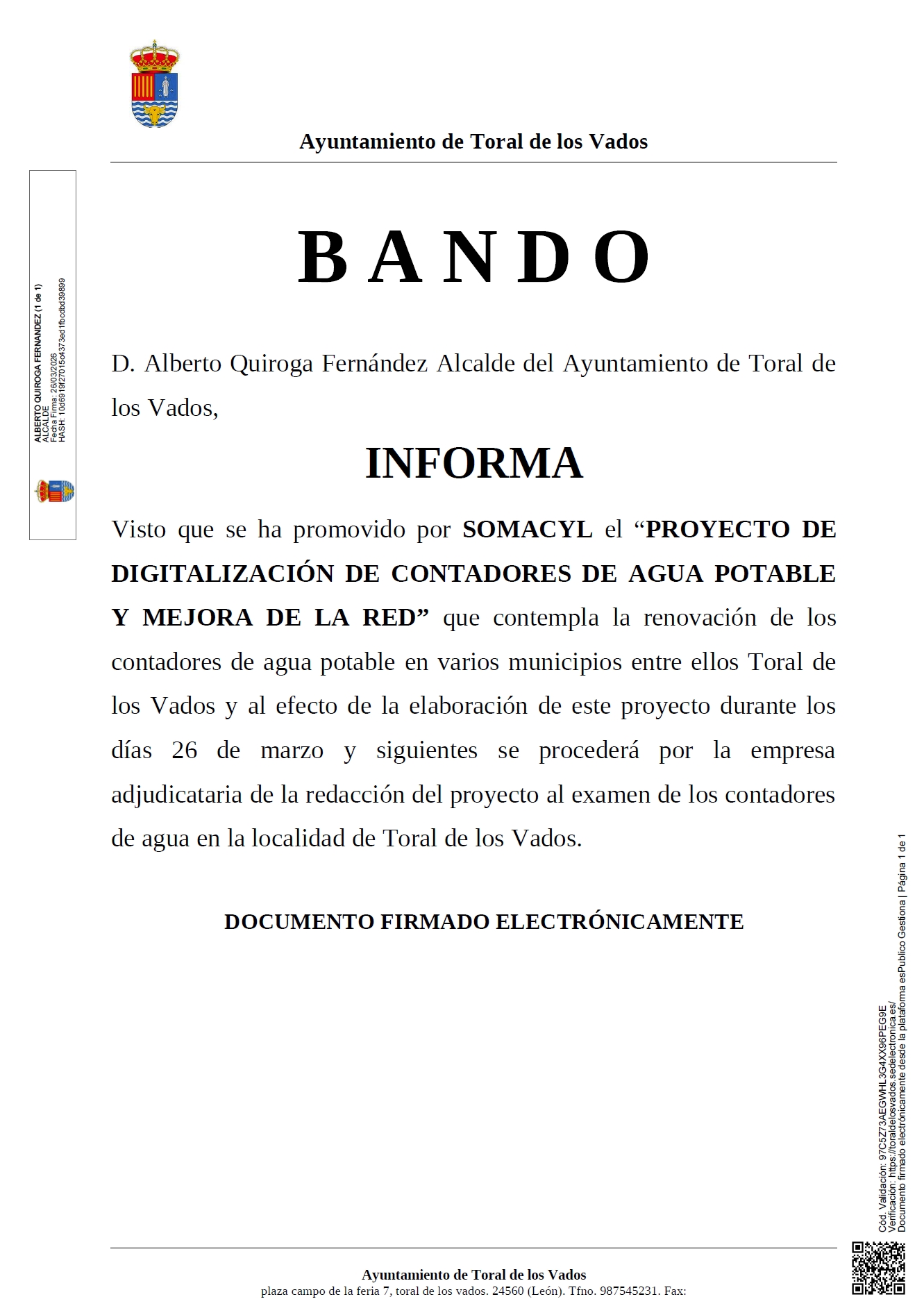 Visto que se ha promovido por SOMACYL el “PROYECTO DE DIGITALIZACIÓN DE CONTADORES DE AGUA POTABLE Y MEJORA DE LA RED” que contempla la renovación de los contadores de agua potable en varios municipios entre ellos Toral de los Vados y al efecto de la elaboración de este proyecto durante los días 26 de marzo y siguientes se procederá por la empresa adjudicataria de la redacción del proyecto al exam(...)