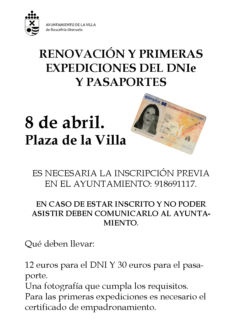 Nos comunican desde la Jefatura Superior de Policía, que tienen previsto asistir a Rascafría para la expedición de DNI el próximo mes de abril. Cuando confirmen la fecha exacta se abrirá el periodo de inscripciòn.