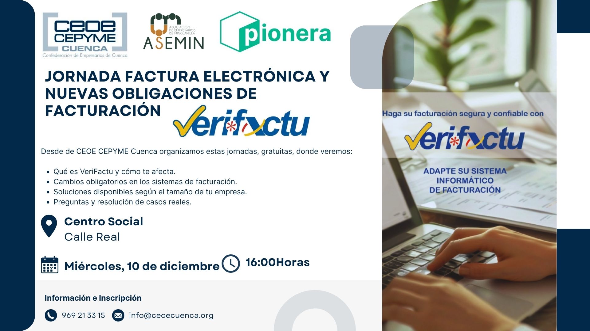 En esta jornada, gratuita y presencial, aprenderás a emitir facturas electrónicas conforme a la nueva normativa, tanto mediante software de facturación como a través de Verifactu, el sistema impulsado por la Agencia Tribu(...)