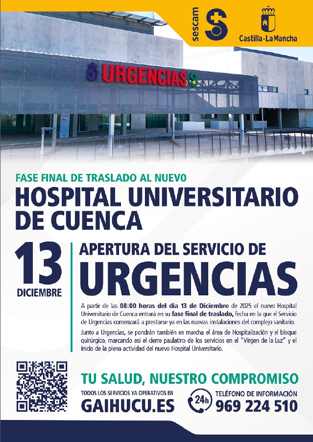 Desde el SESCAM se informa que desde el día 13 de diciembre a las 08:00h el Servicio de Urgencias de Cuenca comenzará a prestarse ya en las nuevas instalaciones del complejo sanitario Hospital Universitario de Cuenca.
