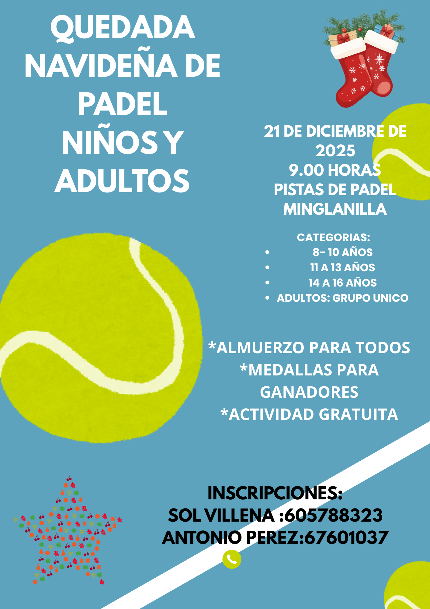 Este domingo 21 de diciembre, desde las 9:00horas, celebramos la Quedada Navideña de Pádel para niños y adultos en las 📍Pistas de Pádel de Minglanilla.