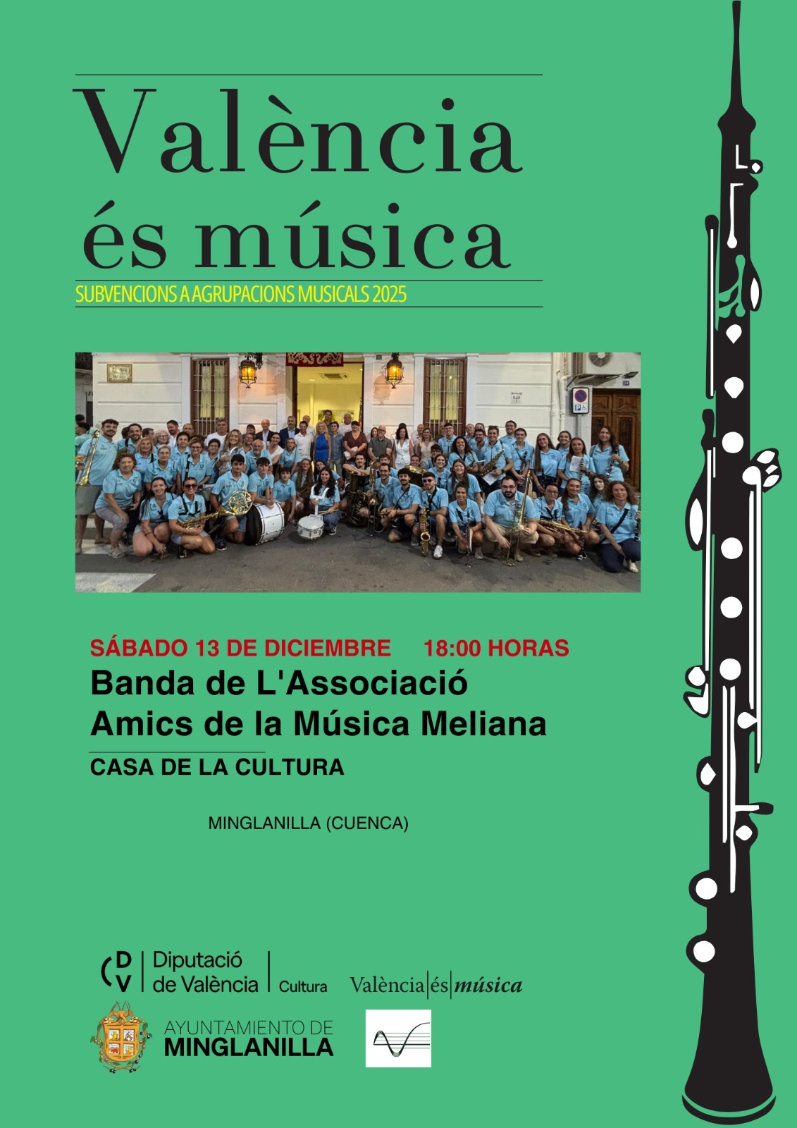 Este sábado 13 de diciembre a las 18:00h, la Casa de la Cultura de Minglanilla se llenará de música con la actuación de la Banda de l’Associació Amics de la Música Meliana (@amicsmusicameliana )