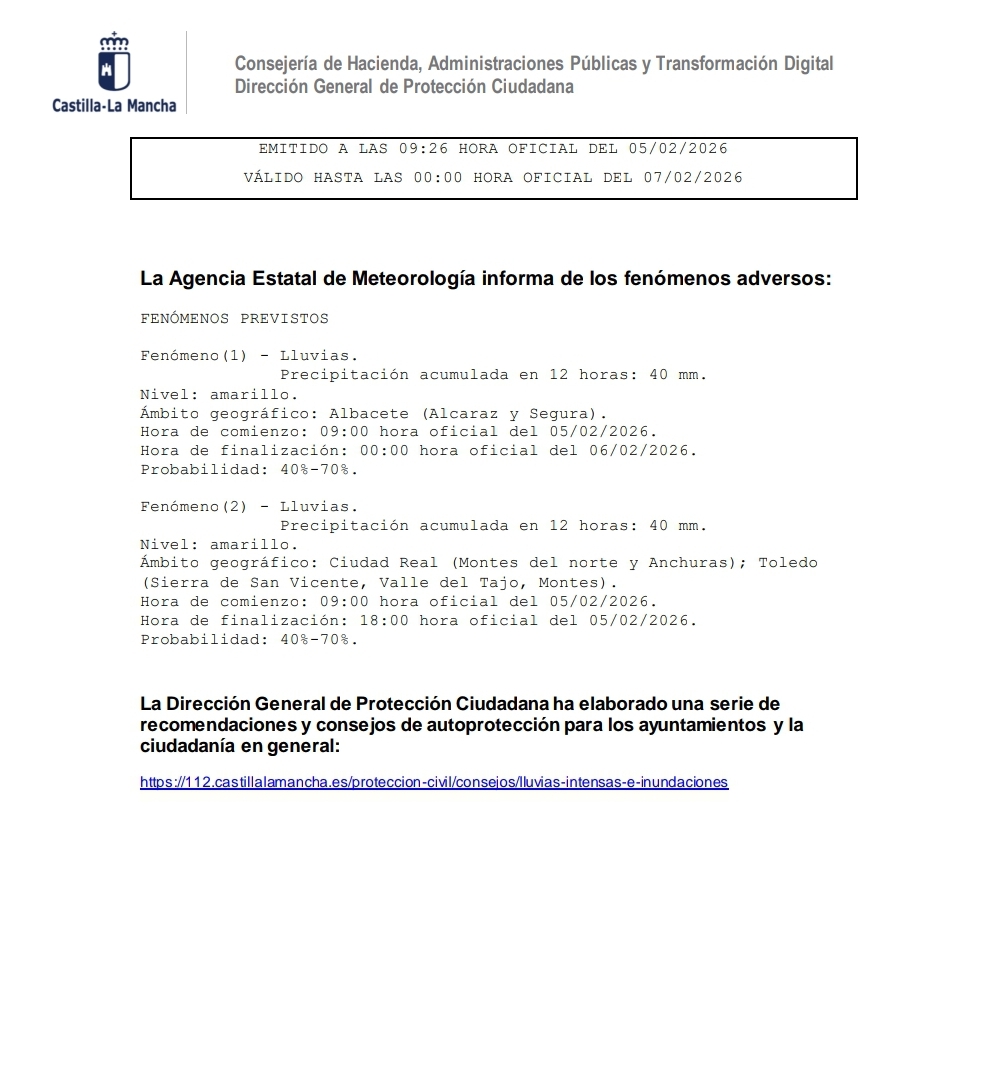 SE RECUERDA, que como consecuencia de las previsiones desfavorables por viento, nieve y lluvias en todas las provincias de Castilla-La Mancha, la Dirección del Plan, ha procedido a la activación del Plan Específico de Protección Civil ante el riesgo por Fenómenos Meteorológicos Adversos de Castilla-La Mancha (METEOCAM), en Fase de ALERTA Situación Operativa 0 para toda la región.