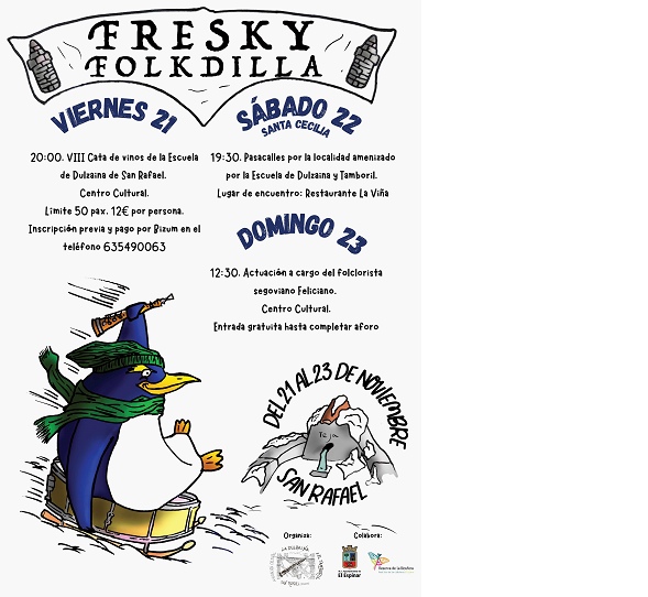 Tras el éxito del primer Festival invernal Freski Folkdilla, organizado por la Escuela de Dulzaina y Tamboril de San Rafael en 2024, donde tuvimos el privilegio de contar con la actuación de Luis Antonio Pedraza, la VII Cata de Vinos y un taller de iniciación al ritmo de panaderas, los próximos 21, 22 y 23 de noviembre de 2025, coincidiendo con la patrona de la música, Santa Cecilia, se celebrará en la localidad de San Rafael su segunda edición. En esta ocasión contaremos con la actuación de otro folclorista reputado, Feliciano, vecino de Segovia; se realizará el tradicional pasacalles de Santa Cecilia por parte de la Escuela; y se celebrará la VIII Cata de Vinos.