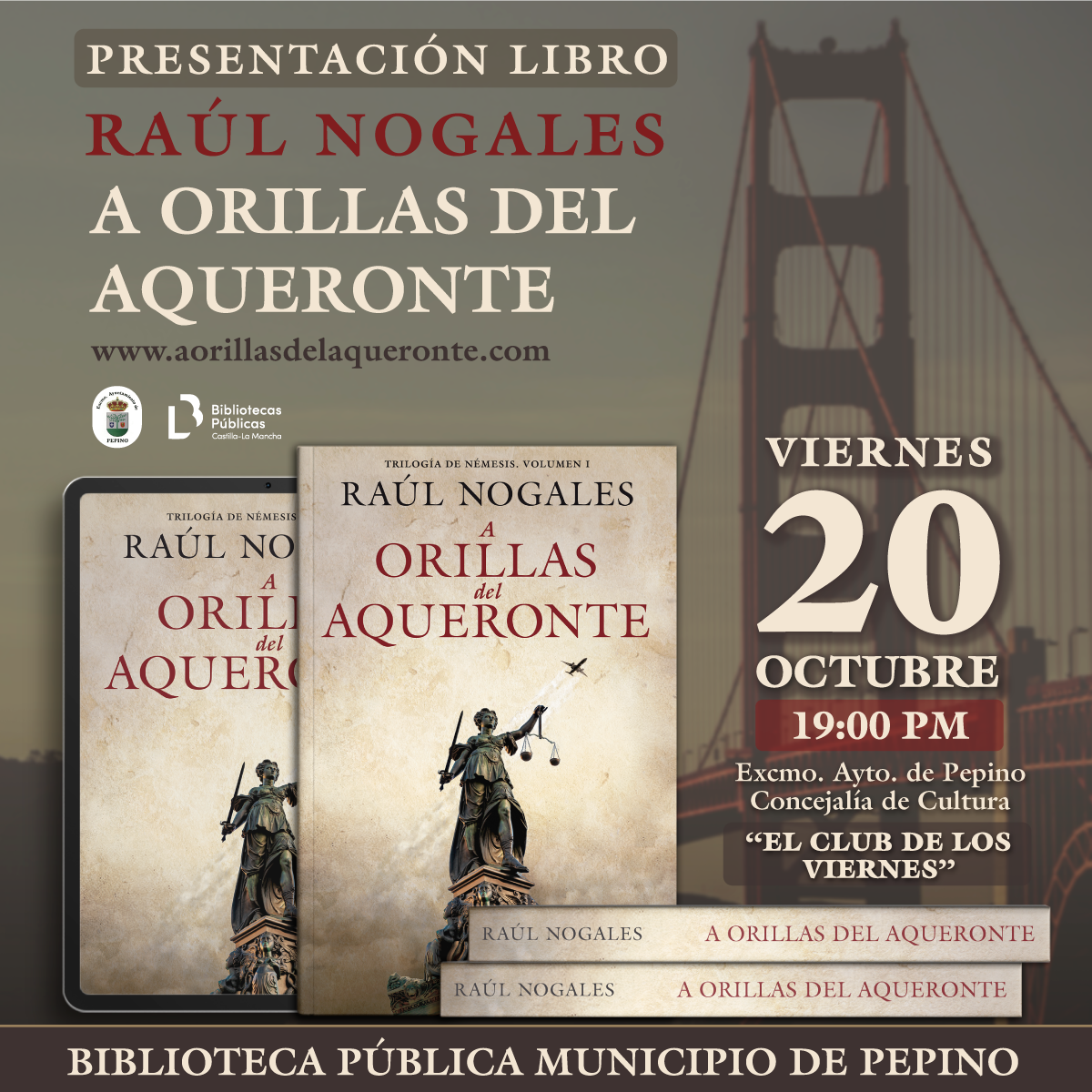 Este viernes 20 de octubre a las 19:00 pm tendrá lugar en la Biblioteca Pública Municipal de Pepino la presentación del Libro "A ORILLAS DEL AQUERONTE", escrita por Raúl Nogales, actividad enmarcada dentro del programa "El club de los viernes". Organiza la Concejalía de Cultura del Ayuntamiento de Pepino.