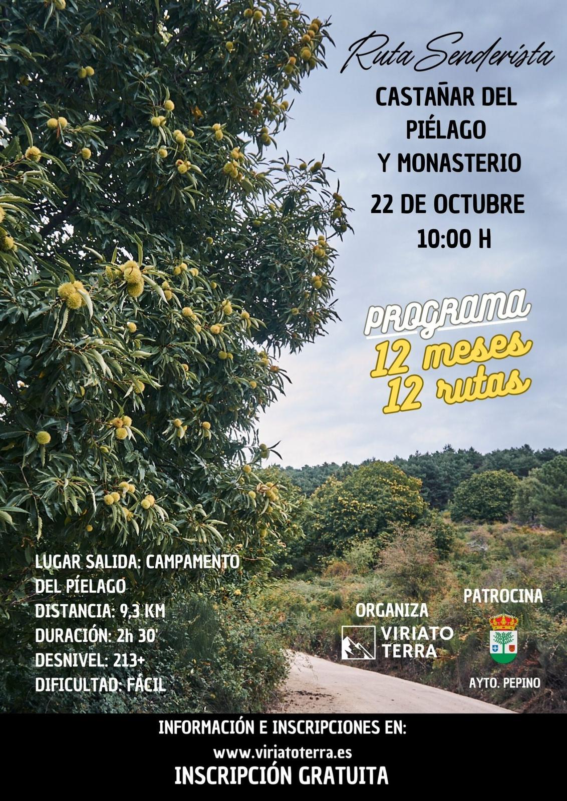El próximo domingo 22 de octubre a las 10:00 h tendrá lugar una RUTA SENDERISTA A CASTAÑAR DEL PIÉLAGO Y MONASTERIO, organizada por VIRIATO TERRA y patrocinada por el Ayuntamiento de Pepino. INSCRIPCIÓN GRATUITA.