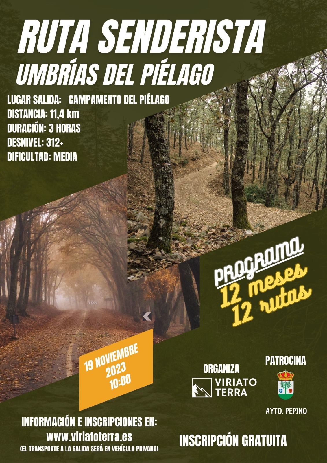 El domingo 19 de noviembre, a las 10:00 horas, tendrá lugar la RUTA SENDERISTA UMBRÍAS DEL PIÉLAGO, dentro del programa 12 meses, 12 rutas, patrocinado por el Ayuntamiento de Pepino. INSCRIPCIÓN GRATUITA.