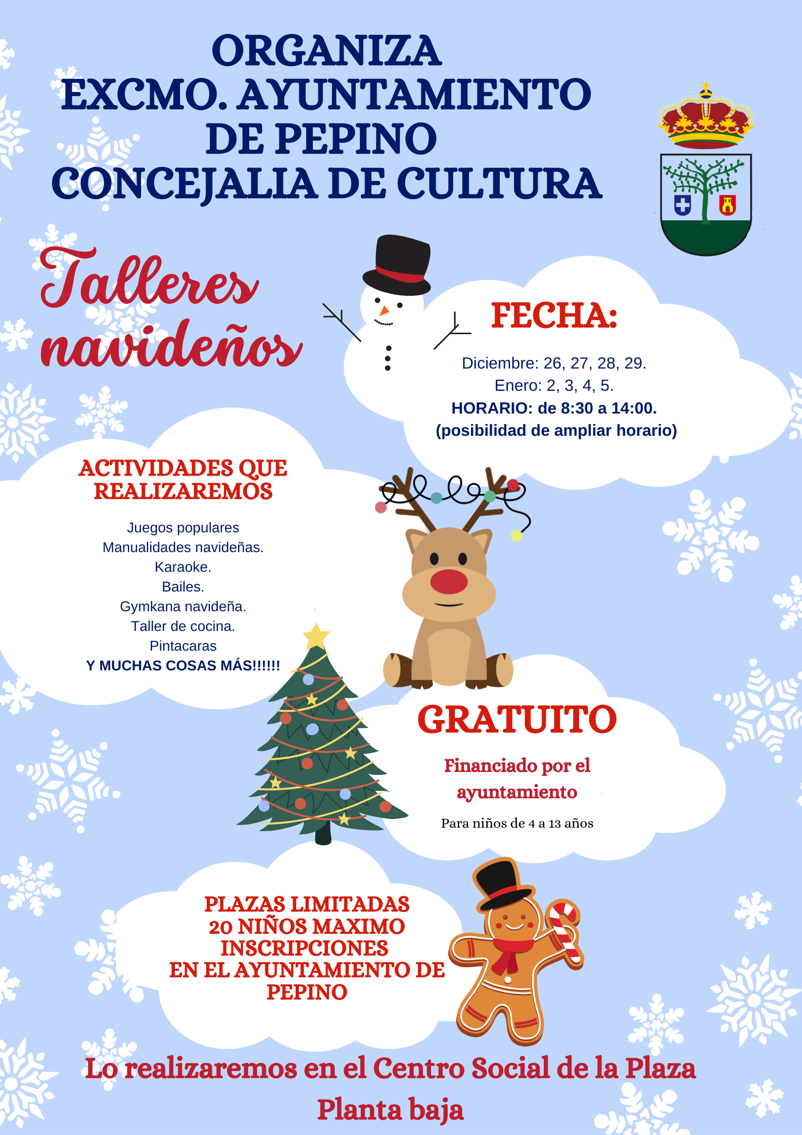 La Concejalía de Cultura del Excelentísimo Ayuntamiento de Pepino organiza varios TALLERES NAVIDEÑOS, para niños de 4 a 13 años, con el fin de ayudar a las familias a conciliar la vida laboral y familiar durante el periodo de vacaciones navideñas.