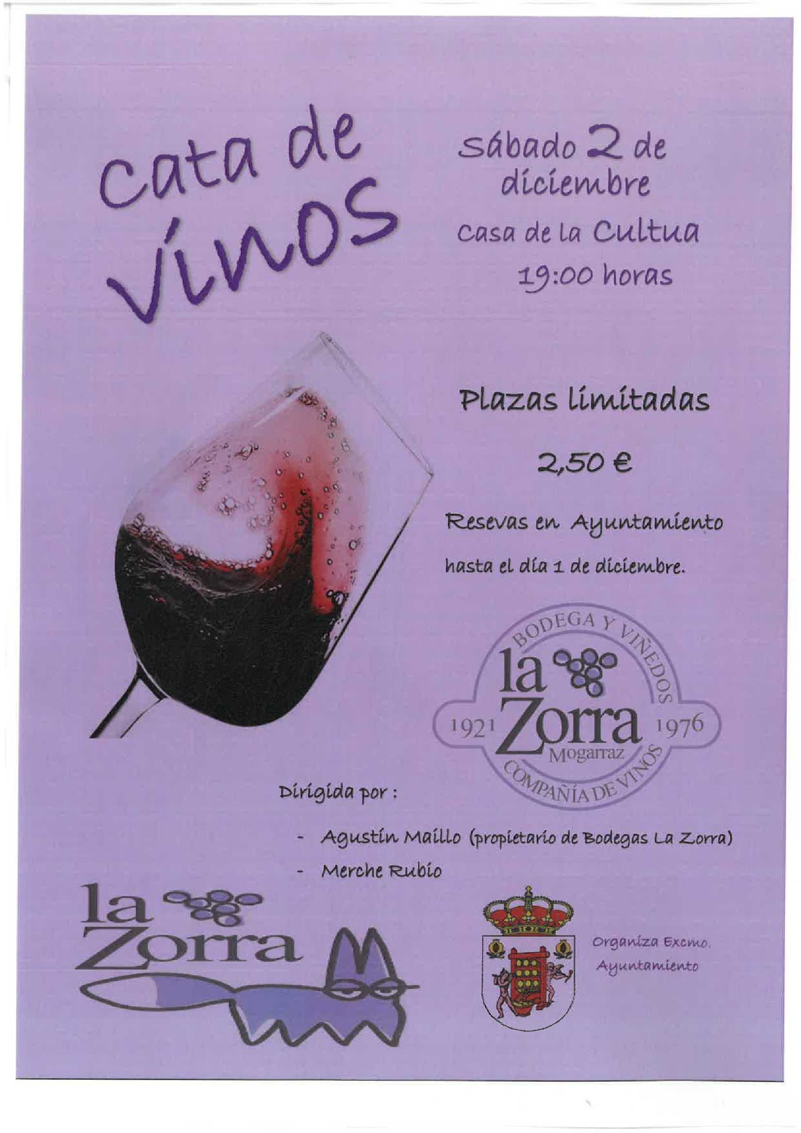 Se informa a tod@s l@s interesad@s, que el próximo 2 de Diciembre se realizará una cata de vino dirigida por Agustín Mahillo (propietario de bodegas La Zorra) y Merche Rubio.