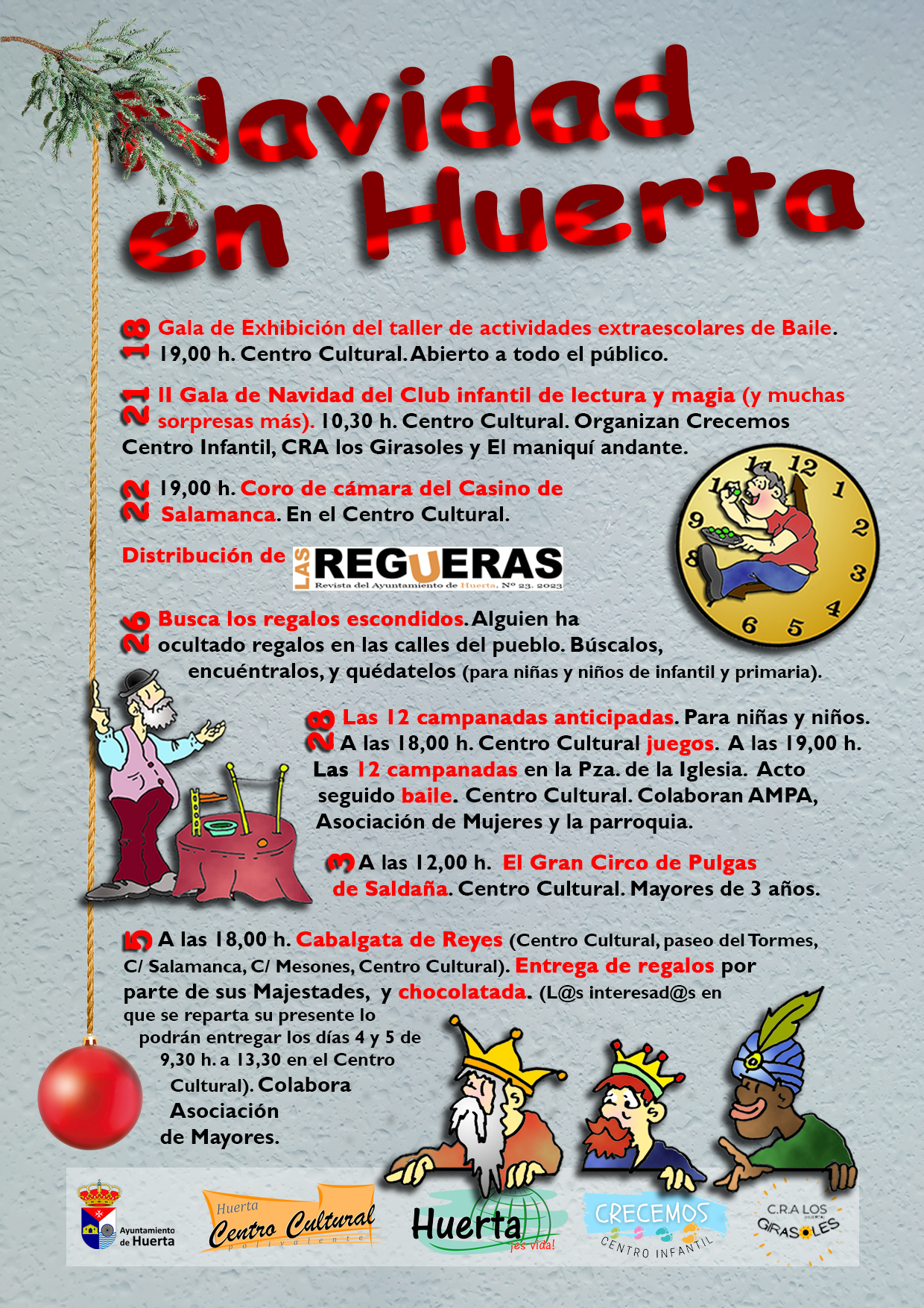 28 de Diciembre: Las doce campanadas anticipadas. JUEGOS para niños a las 18:00 en el Centro Cultural, a las 19:00 LAS 12 CAMPANADAS 🔔 anticipadas, en la plaza de la iglesia, acto seguido BAILE 🎉en el Centro Cultural.