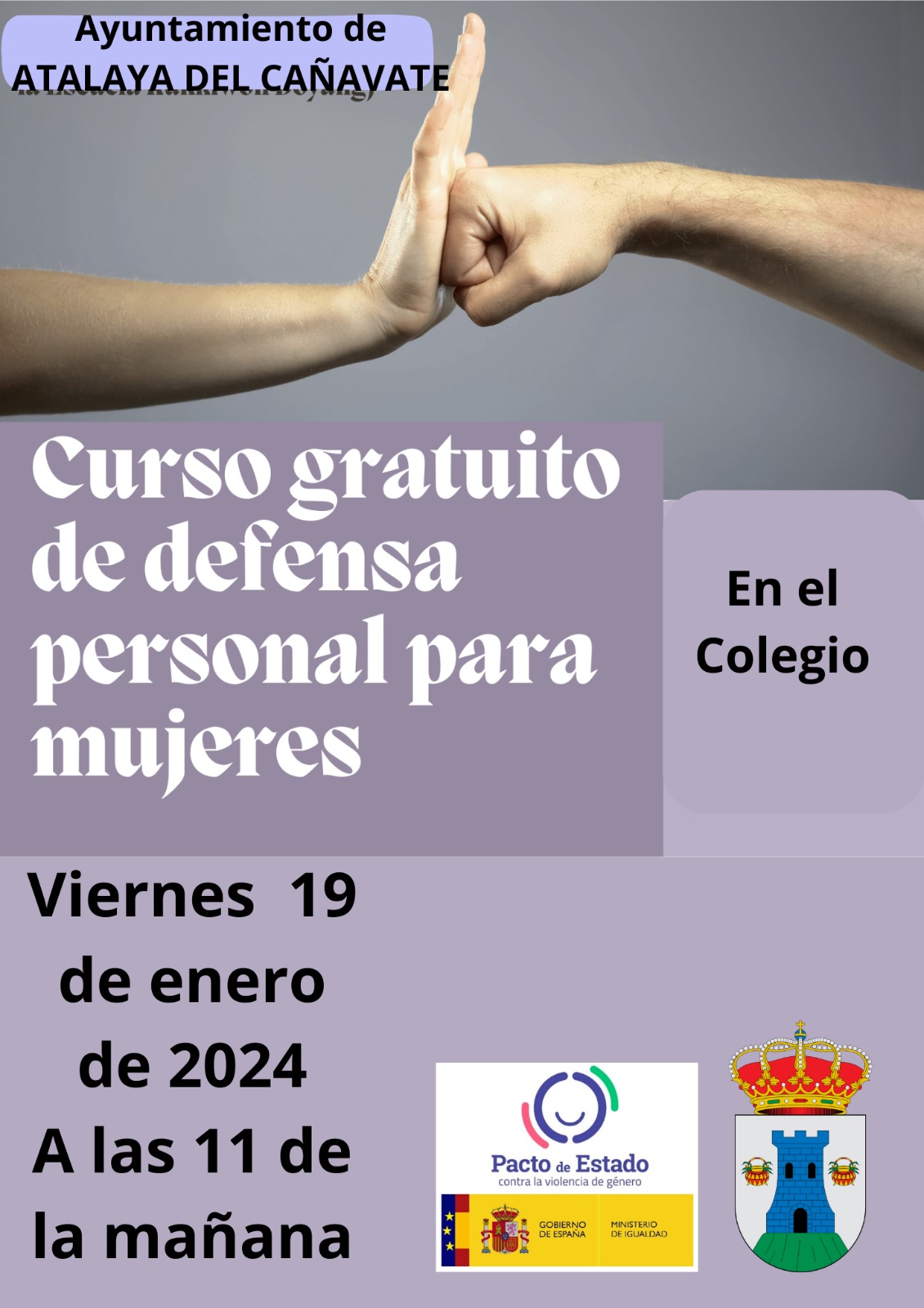 El viernes a las 11, se va a realizar un TALLER DE DEFENSA PERSONAL EN ATALAYA DEL CAÑAVATE.Es muy importante asistir ya que nos va a enseñar a resolver situaciones en las que nos podemos ver inmersos en alguna ocasión.