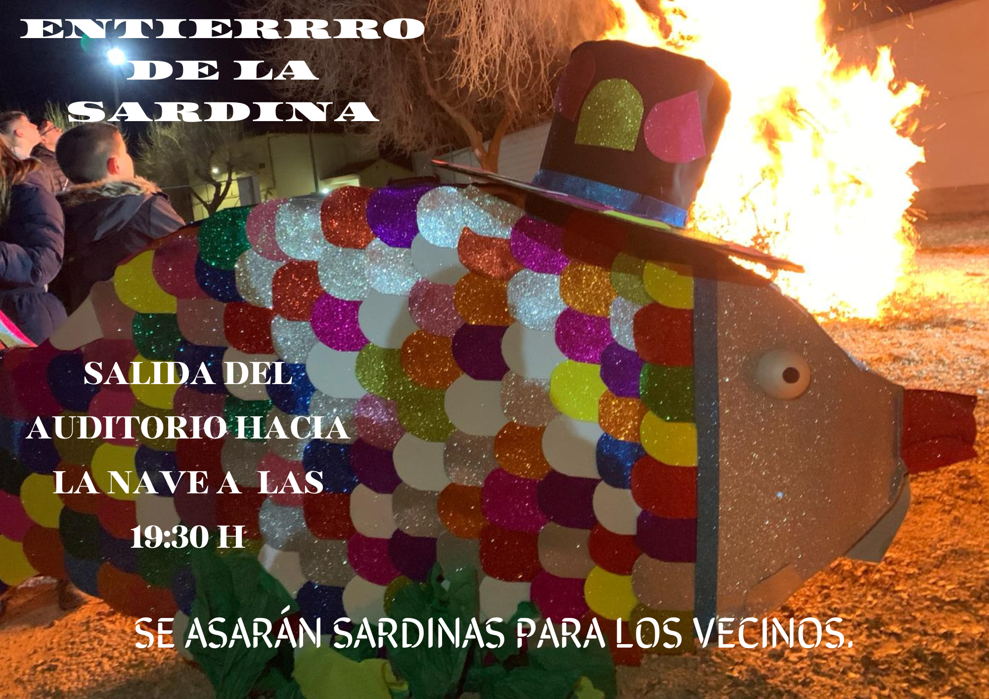 Esta tarde celebraremos el entierro de la sardina. Se saldrá del auditorio a las 19:30 horas en dirección a la nave multiusos.Se asarán sardinas para los vecinos.