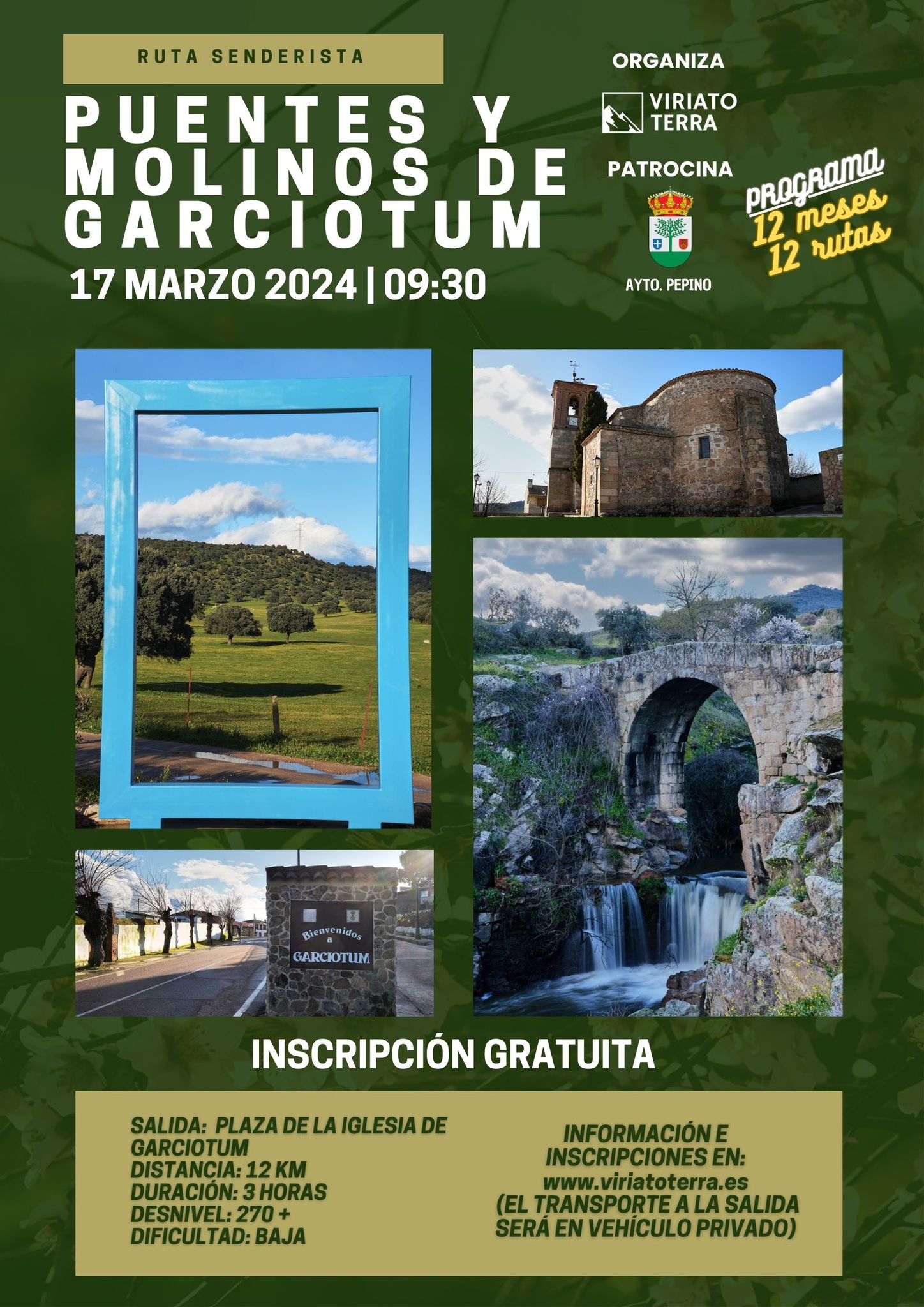 El domingo 17 de marzo tendrá lugar la ruta senderista "PUENTES Y MOLINOS DE GARCIOTUM" , que forma parte de la actividad 12 MESES, 12 RUTAS, que realiza el Excmo. Ayuntamiento de Pepino junto con Viriato Terra.