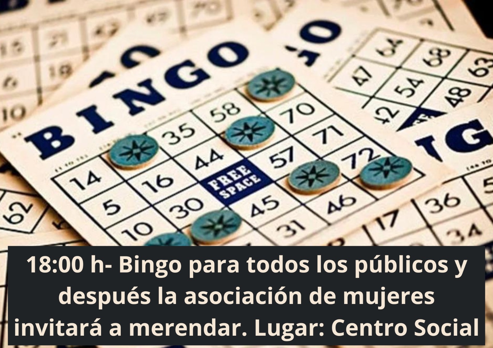 Esta tarde a las 6, tenemos BINGO en el CENTRO SOCIAL para todos los públicos.Tras éste, la Asociación de Mujeres invitará a merendar.No os lo podéis perder.