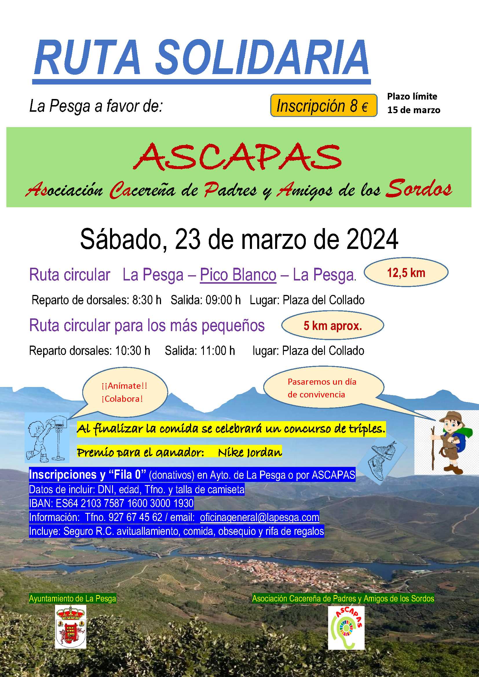 Se informa a todos los inscritos a la Ruta Solidaria de ASCAPAS, que mañana debido al mercadillo de los sábados, las camisetas se repartirán en la puerta del consultorio médico.