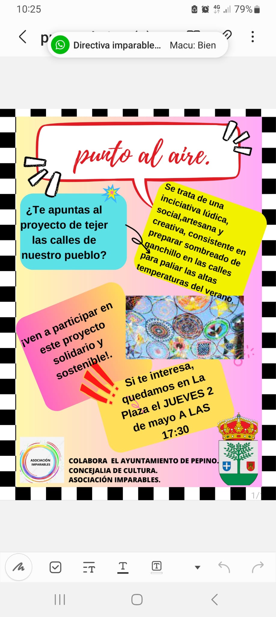 La ASOCIACIÓN IMPARABLES de Pepino, organiza el proyecto solidario y sostenible PUNTO AL AIRE, una iniciativa lúdica, social, artesana y creativa, consistente en preparar un sombreado de ganchillo en las calles del municipio.