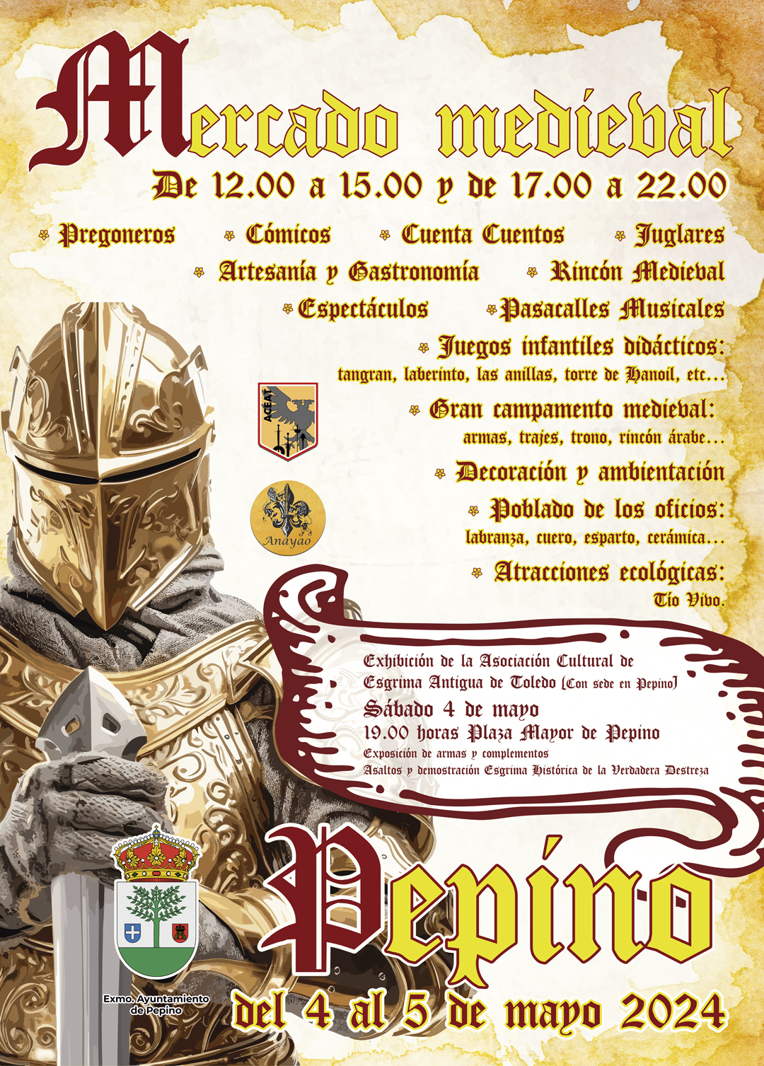 El próximo fin de semana, 4 y 5 de mayo, tendrá lugar el MERCADO MEDIEVAL DE PEPINO, con un montón de actividades, en horario de 12:00 h a 15:00 h y de 17:00 h a 22:00 h.