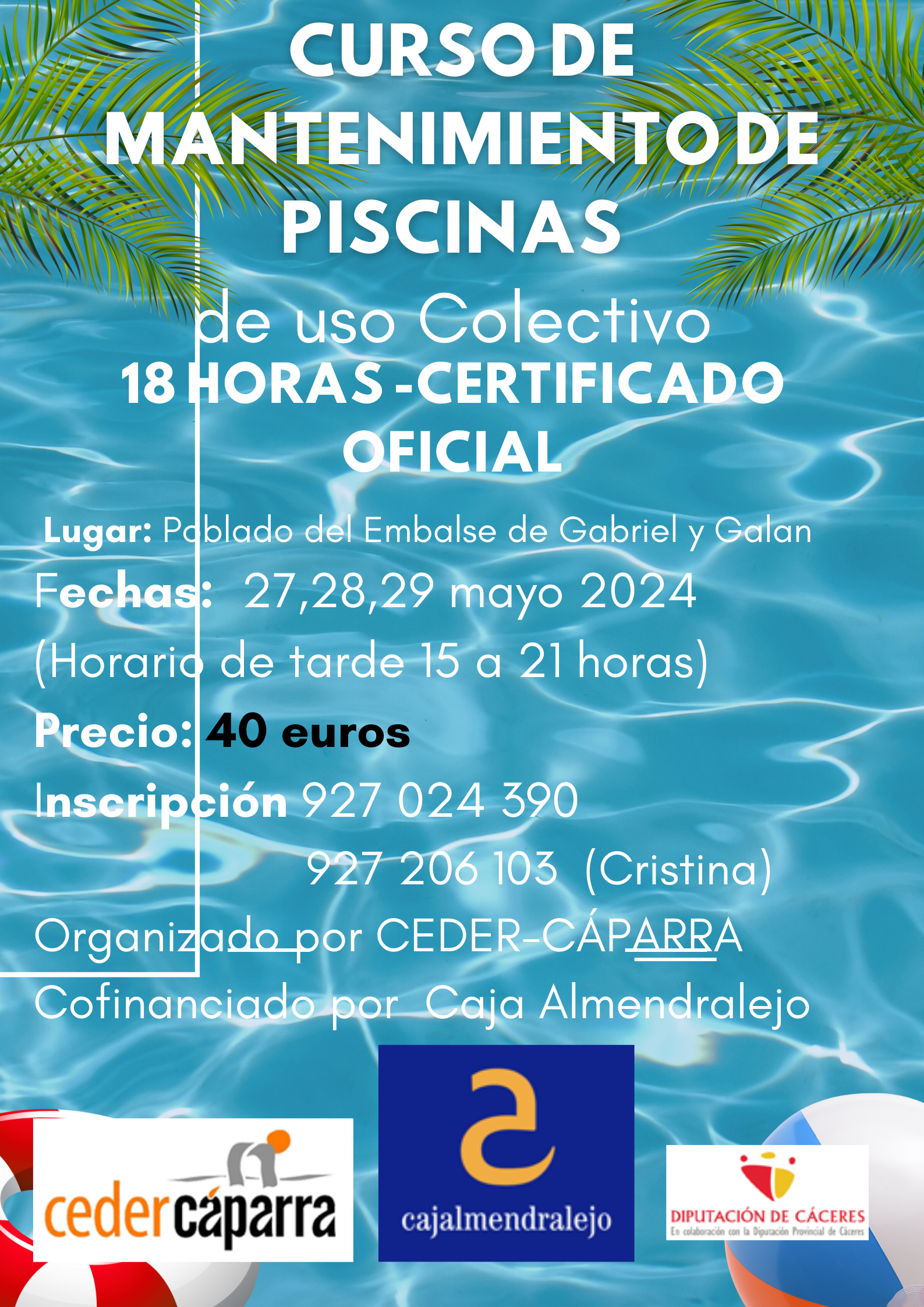 RECORDAMOS que el lunes 27 de mayo comienza el Curso demantenimiento de piscinas de uso colectivo, con obtención de certificado, en el poblado del pantano. InscrÃbete llamando al 927024390. Te interesa para trabajar en verano.