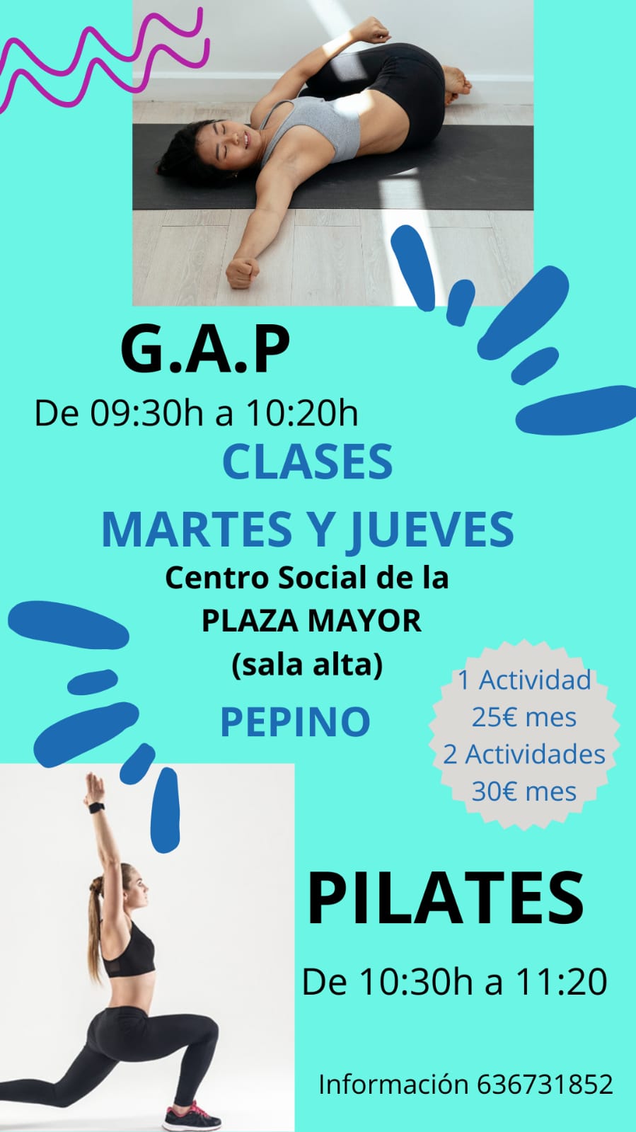 Se informa que se cambia el horario de las clases de G.A.P. que se impartirán de 9:30h a 10:20h, así como de las clases de Pilates, que serán de 10:30h a 11:20h.