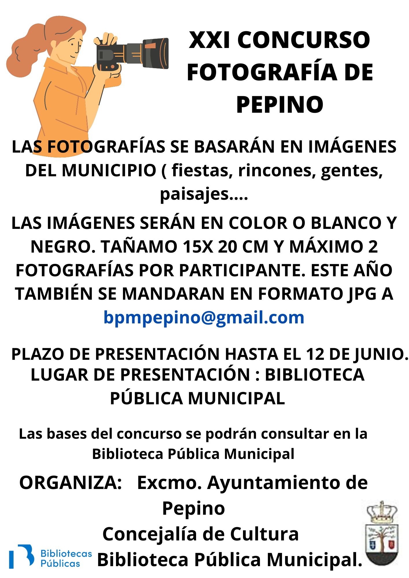 A partir del día siguiente de esta publicación y hasta el día 12 de junio se podrán presentar las fotografías en la Biblioteca Pública Municipal de Pepino sita en la Plaza del Ayuntamiento 1.