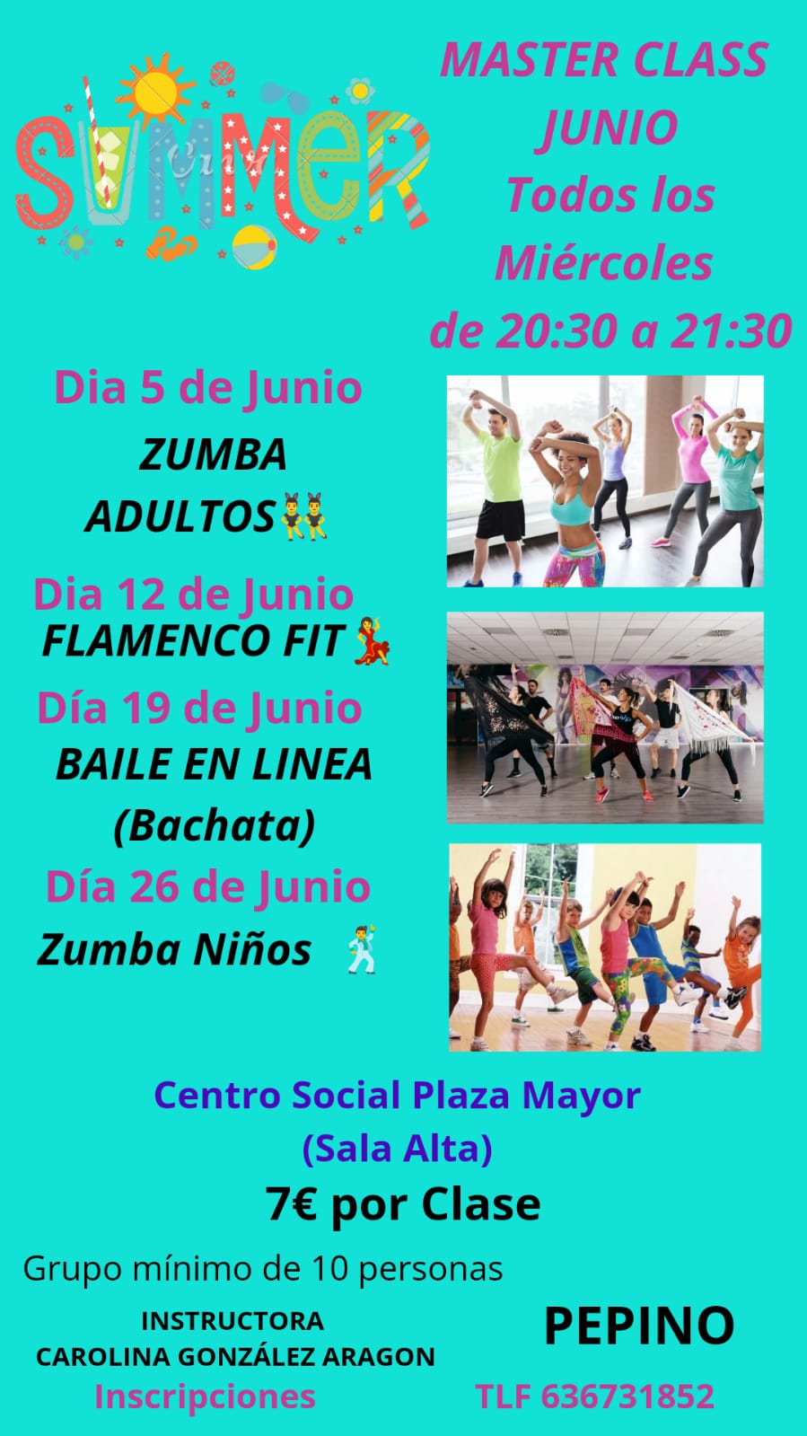 Se informa que se ha rectificado la tarifa de las clases "MASTER CLASS JUNIO" con un coste de 7€ por sesión. Disculpen las molestias.