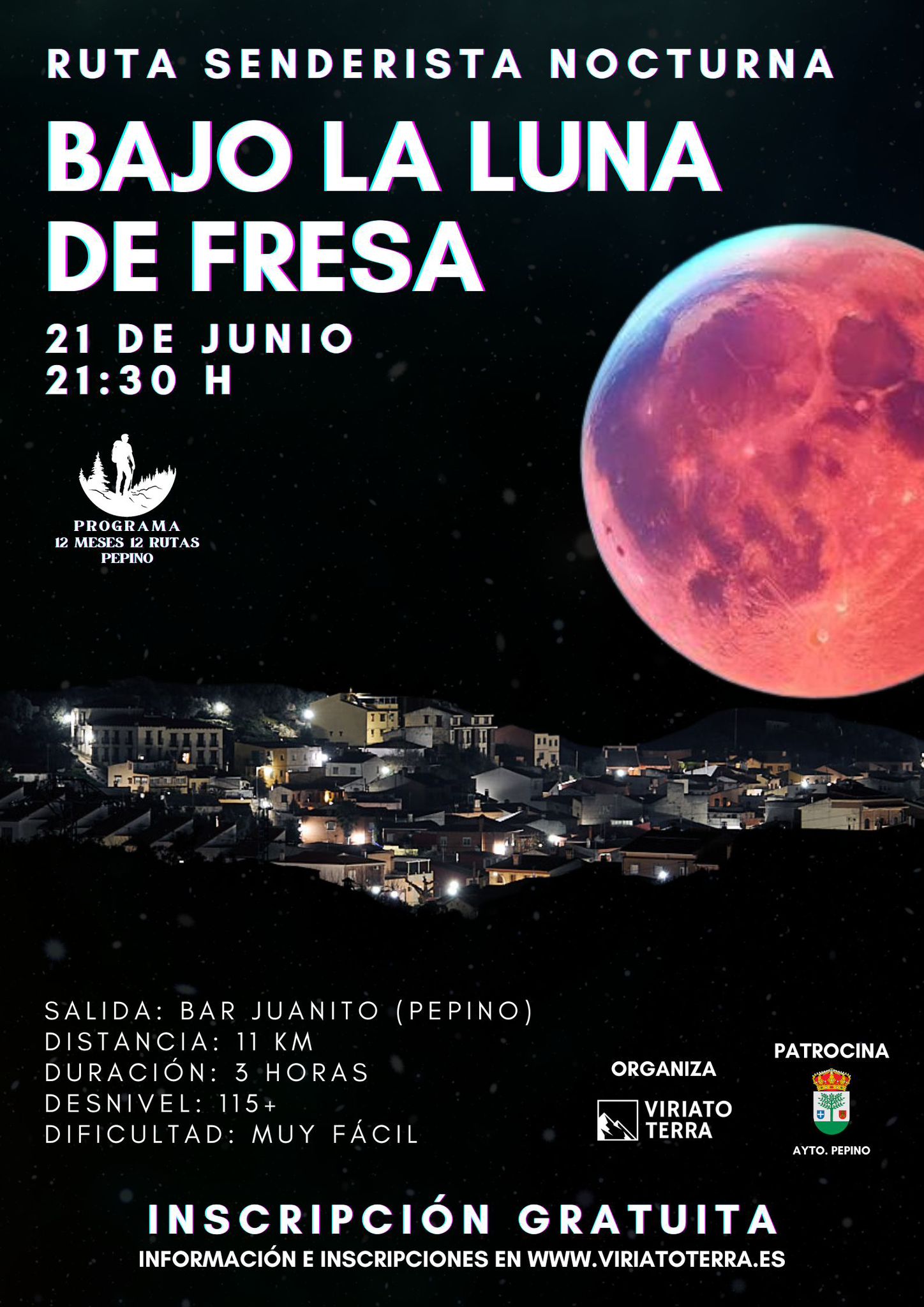 El viernes 21 de junio de 2024 tendrá lugar la ruta senderista "BAJO LA LUNA DE FRESA", que forma parte de la actividad "12 MESES, 12 RUTAS", que realiza el Excmo. Ayuntamiento de Pepino junto con Viriato Terra.