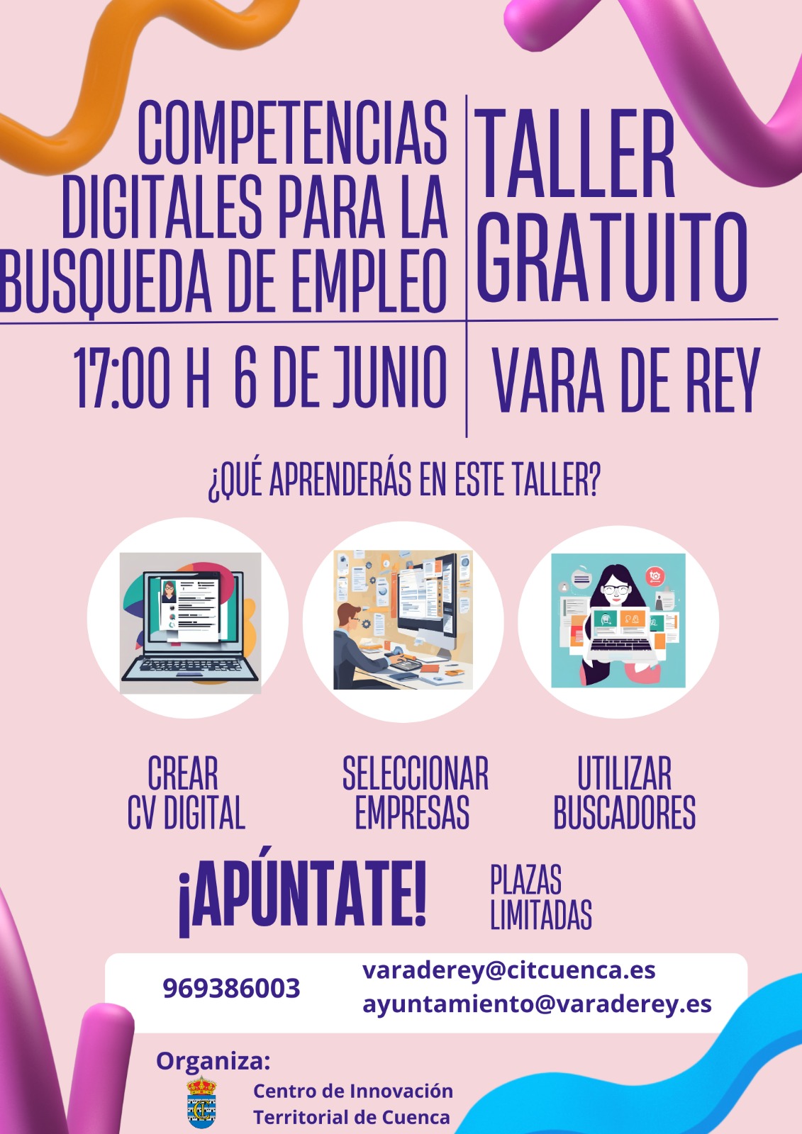 El 6 de junio a las 5 de la tarde, en el Centro Sociocultural, se va a impartir un TALLER DE COMPETENCIAS DIGITALES PARA LA BÚSQUEDA DE EMPLEO, dirigido a desempleados o a personas que quieran mejorar el empleo.
