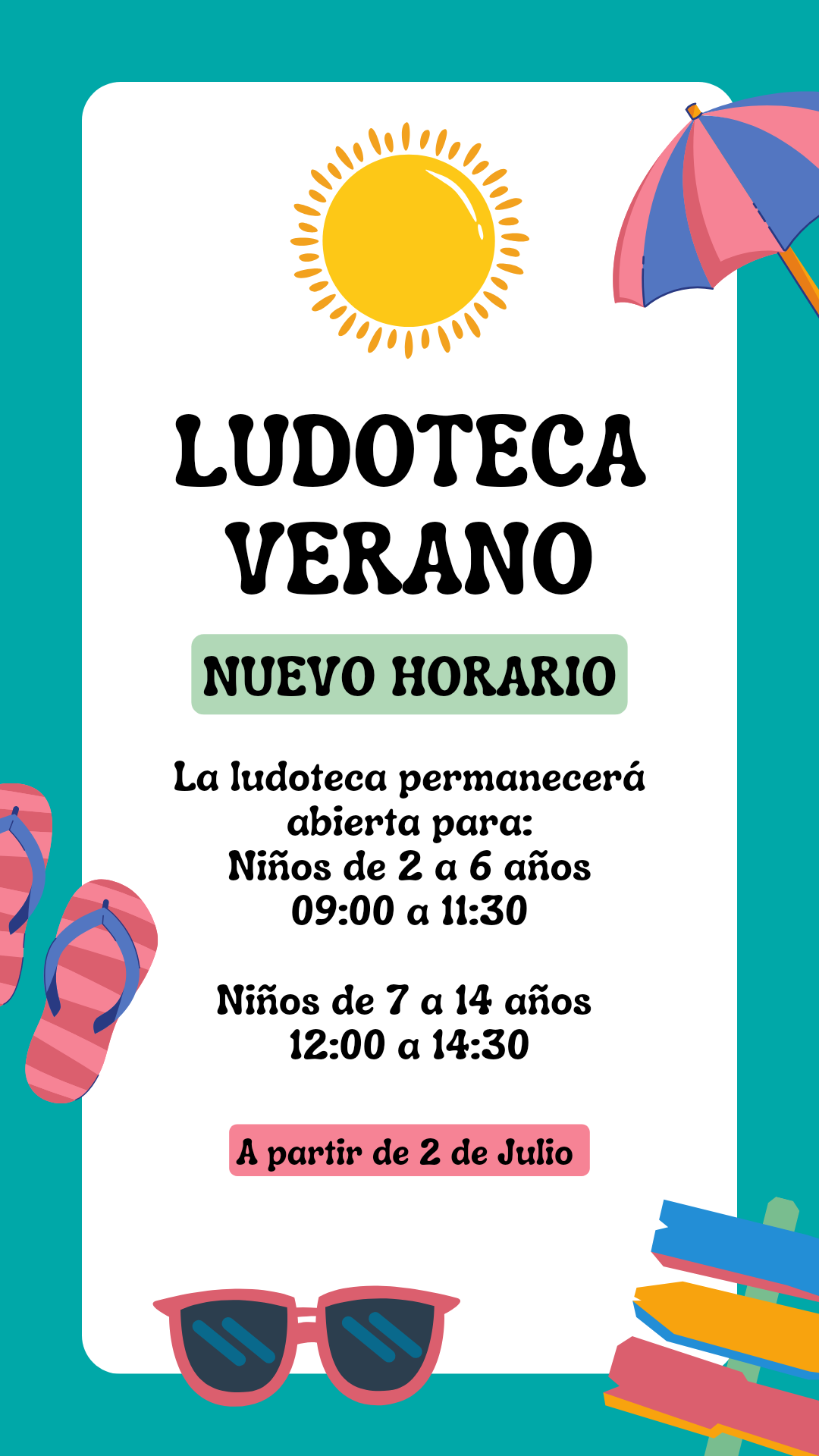 Se informa a todos los niños y niñas de LUDOTECA que a partir de mañana se cambiará el horario:niñ@s de 2-6 años de 09:00h-11:30hniñ@s de 7-14 años de 12:00-14:30h