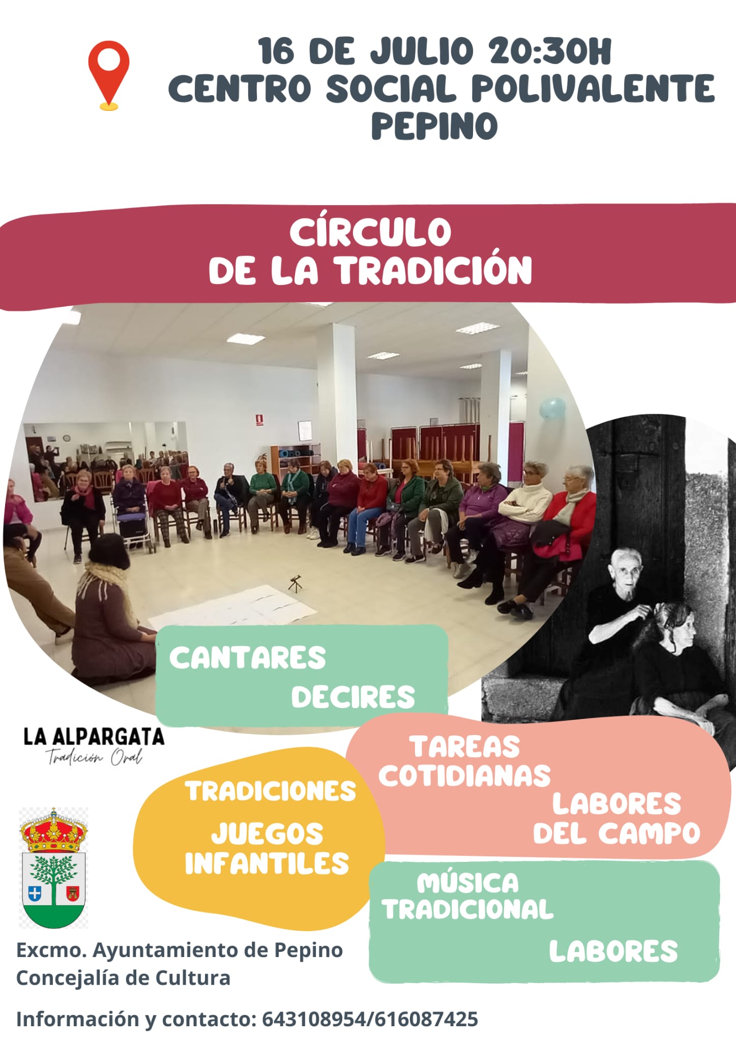 Se convoca a los mayores del término municipal de Pepino a una reunión con la Asociación Cultural "La Alpargata". El objetivo de dicha reunión es que nuestros mayores cuenten y describan las tradiciones y costumbres de toda una vida.
