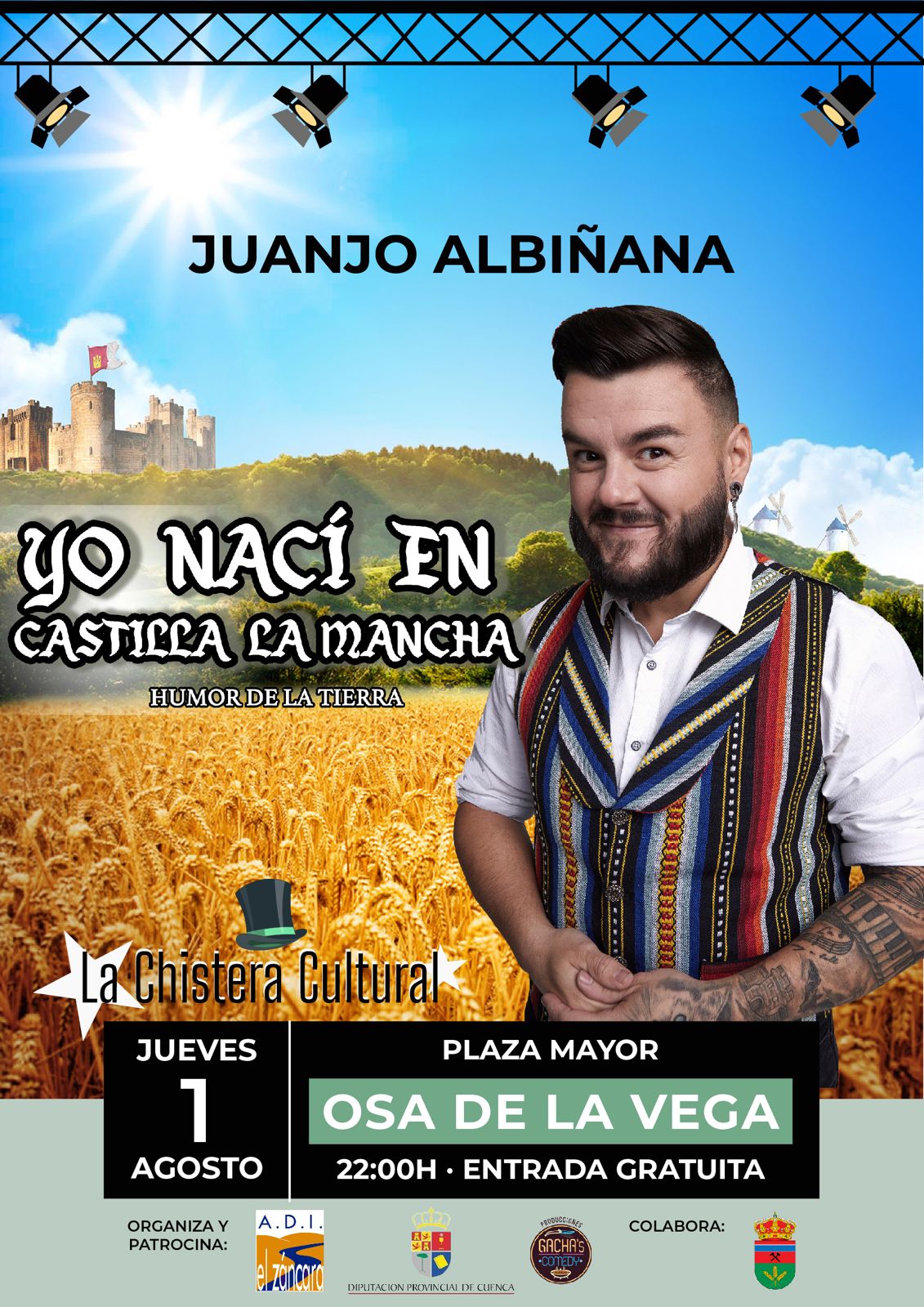 Hoy 1 de agosto a las 22:00 h en la Plaza Mayor, el monologuista Juanjo Albiñana llega con su espectáculo “YO NACI EN CASTILLA LA MANCHA”.