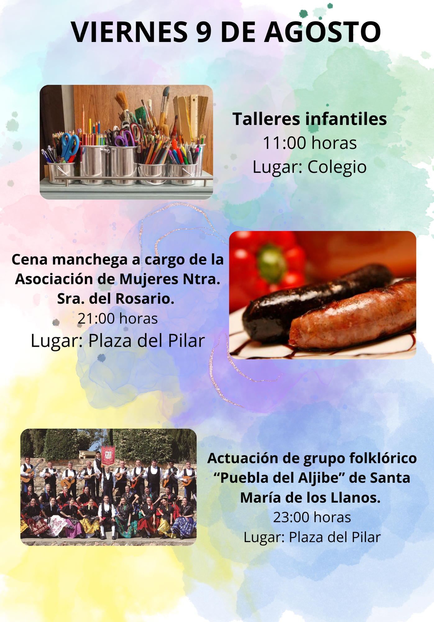 La cena manchega y la Actuación de grupo folklórico “Puebla del Aljibe” de Santa María de los Llanos será en la Plaza.