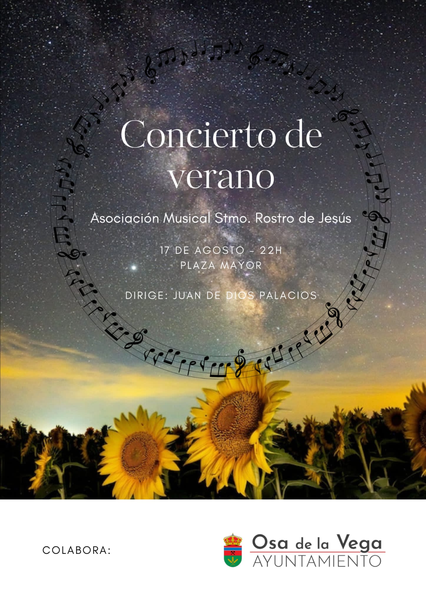 El próximo sábado 17 de agosto a las 22:00 horas, la Asociación Musical Stmo. Rostro de Jesús nos ofrecerá su concierto de verano en la Plaza Mayor de Osa de la Vega. Colabora: Ayuntamiento de Osa de la Vega